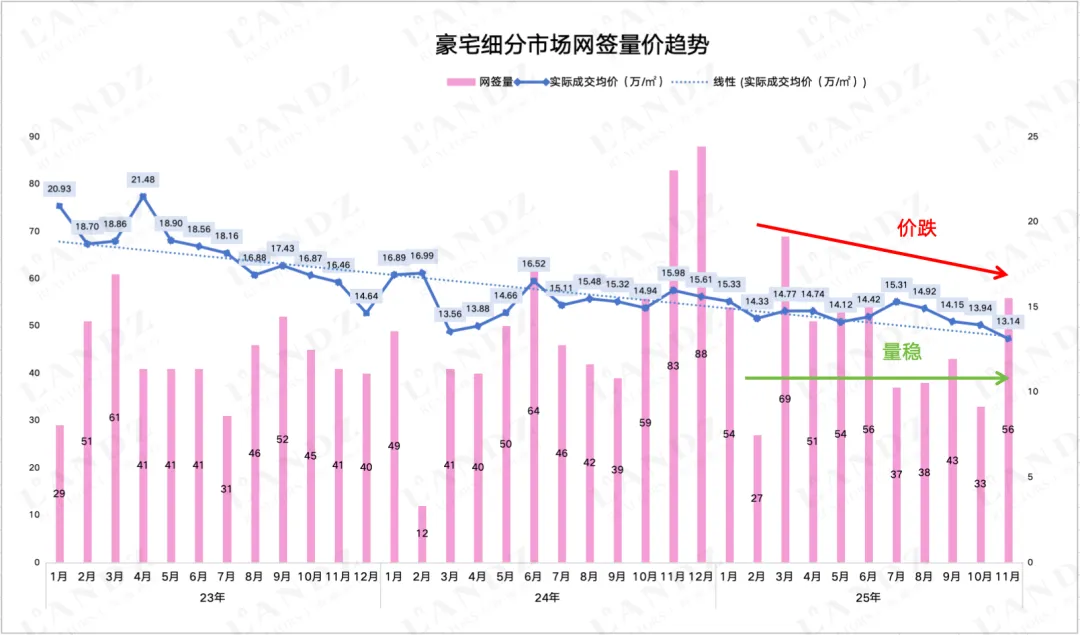 根据丽兹行统计数据显示,豪宅的挂牌成交比在20-25:1之间,供需关系较为合理,处于平衡市场,价格维持相对稳定;