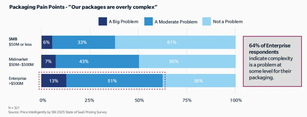 近60%的受访公司认为,自己的定价结构“过于复杂”,导致内外都困惑。公司越大,这个问题越严重——三分之二的大企业将“复杂性”列为核心痛点。