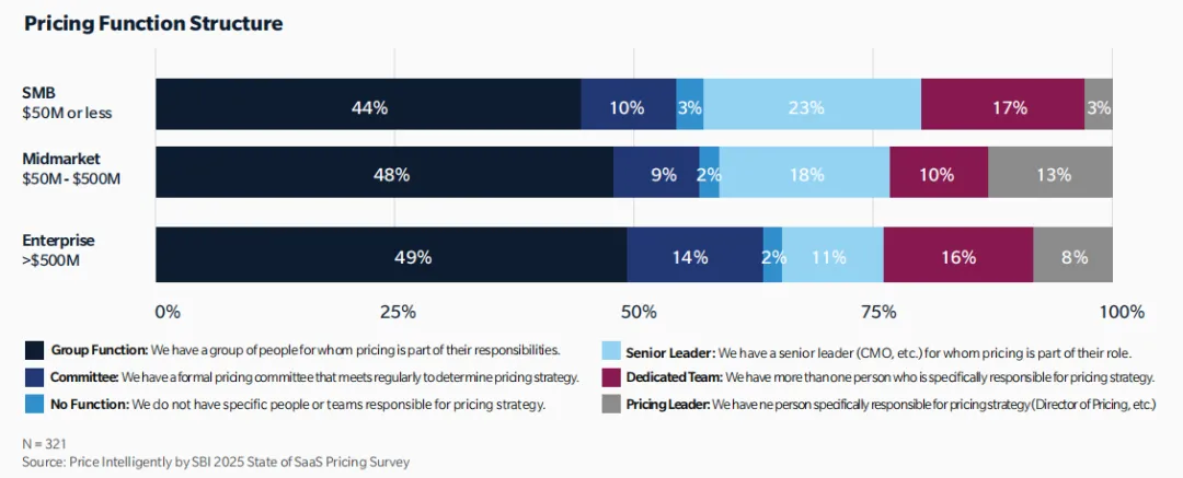 产品、销售、财务、CEO办公室都有可能牵头。73%的公司定价不是由一个人决定的,而是由一个小组或委员会负责。