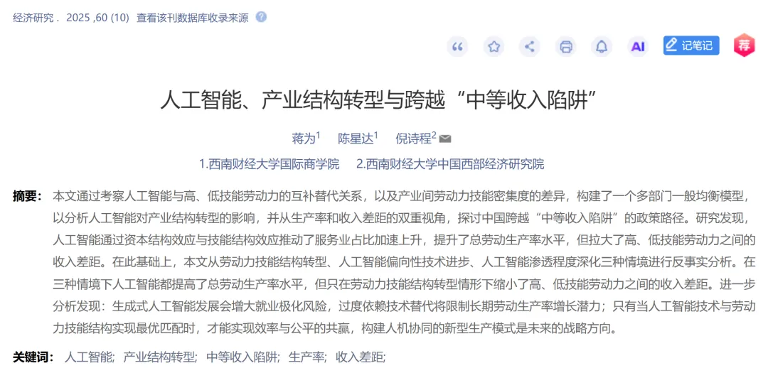 蒋为, 陈星达, 倪诗程. 人工智能、产业结构转型与跨越“中等收入陷阱”[J]. 经济研究, 2025, 60(10): 239-260.