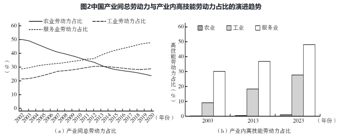 第二,劳动力结构经历由农业、工业向服务业的配置,服务业本身具有高技能密集型特征。