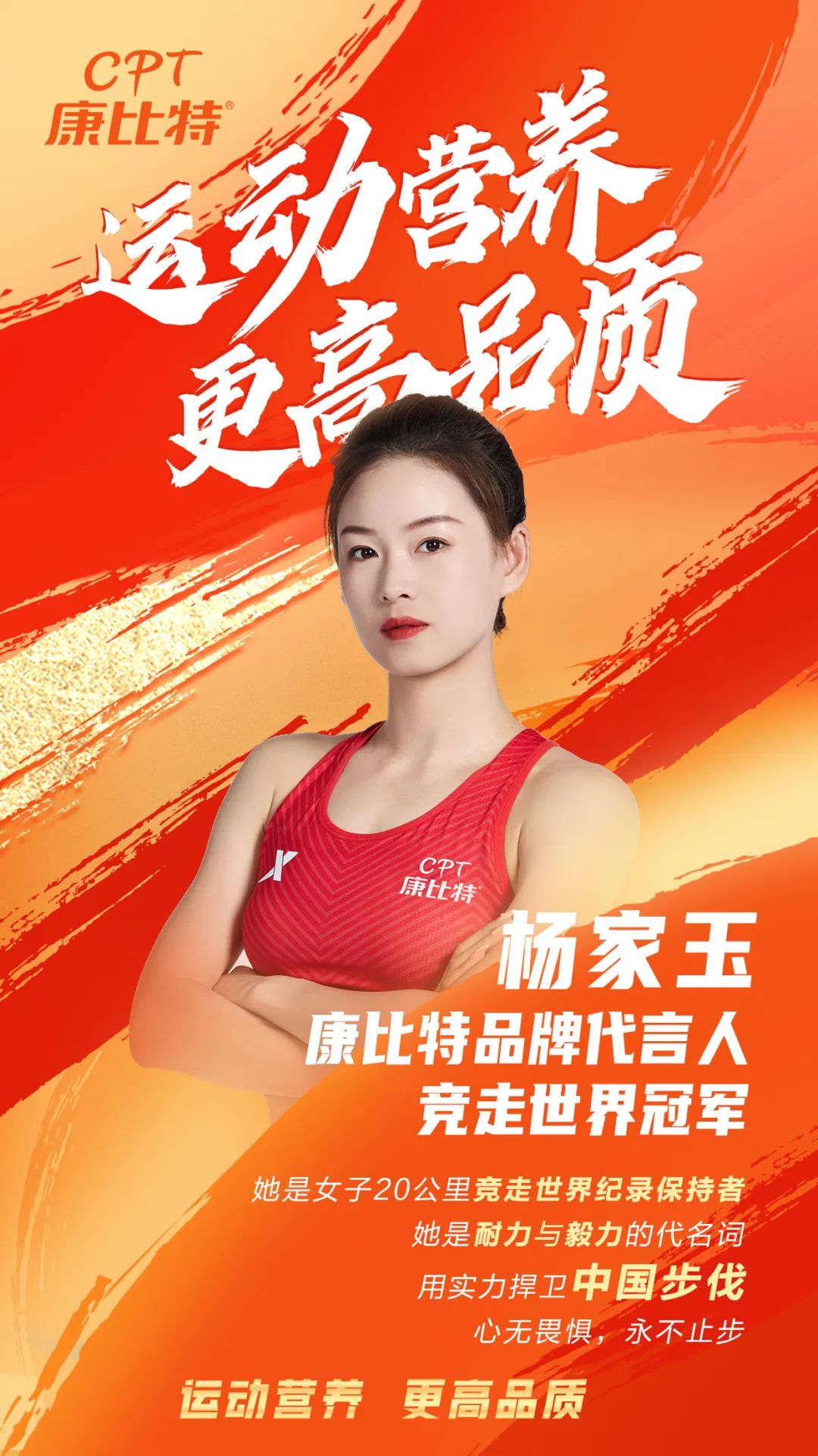 在2023年田径世锦赛开赛前一天, “女子20公里竞走世界冠军”、“世界纪录保持者”--杨家玉正式加入康比特“冠军天团”,成为新晋品牌代言人。