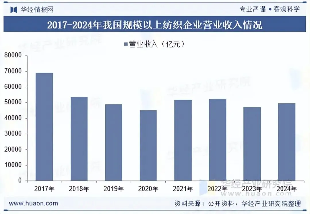 2016年至2020年,在国内外市场环境复杂多变的情况下,国内纺织业企业数量以及主营业务收入整体呈现下降趋势,纺织行业进入淘汰落后产能、优化产业结构的深度调整阶段。2020年至2024年,随着国际贸易摩擦加剧、宏观经济波动、全球产业链重构、国内政策支持推动产业升级等综合影响,纺织业企业营业收入呈现波动上升趋势,企业家数持续增加。根据工信部数据统计,2024年,我国规模以上纺织企业工业增加值同比增长4.4%,营业收入49532.1亿元,同比增长4%。