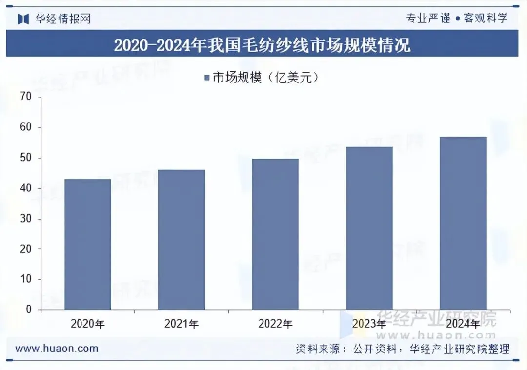 我国毛纺织工业化生产始于19世纪70年代末,在国内外需求持续增加的推动下以及国家产业政策的大力支持下,毛纺织行业稳步发展,形成了上下游产业链配套齐全的生产加工体系,在全球毛纺织行业中占有重要地位。随着我国天然纤维需求增长和高端化趋势推动,我国毛纺纱线市场规模增长显著,2024年整体规模增长至57.2亿元,2020-2024年CAGR约为4.13%。