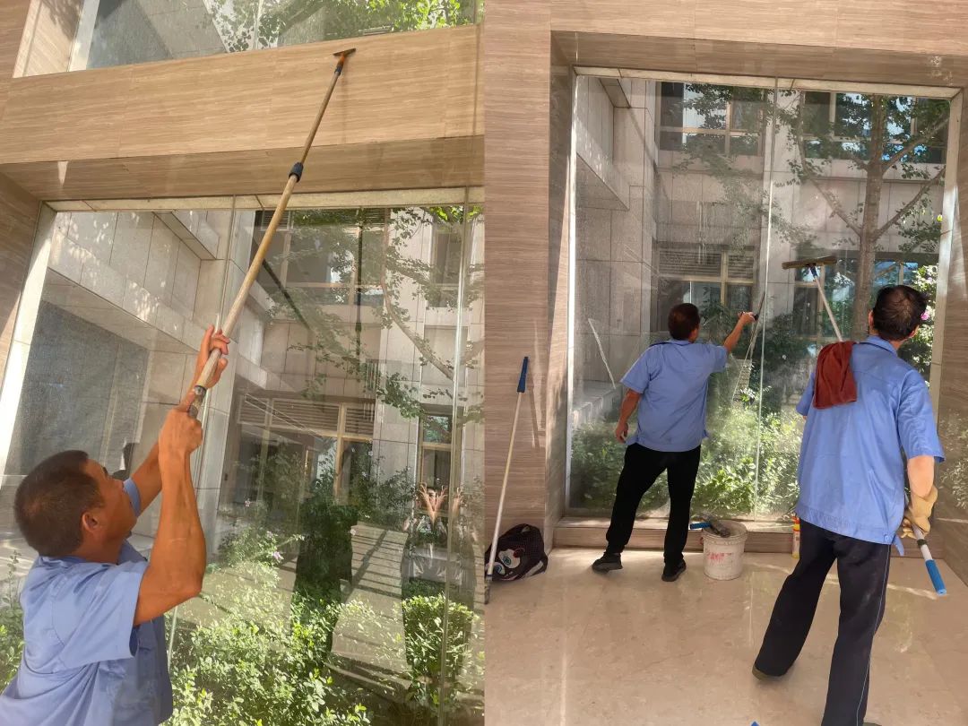 办公楼室内玻璃数量多且较多为玻璃墙,工作量大。按照物业公司的玻璃清洗方案,清洗人员使用专业清洁工具及清洁剂逐层开始作业,全程规范操作,对顽固污渍反复擦洗,不放过每块玻璃,不放过任何角落。清洗玻璃时,工作人员先用湿毛巾擦洗玻璃的表面,再用干毛巾将水吸干、二次擦拭,最后用毛刷清理窗户缝隙灰尘。通过大家的辛勤工作,之前一块块积满灰尘和污渍的玻璃渐渐显示出了它原有的光亮,窗框干净整洁。