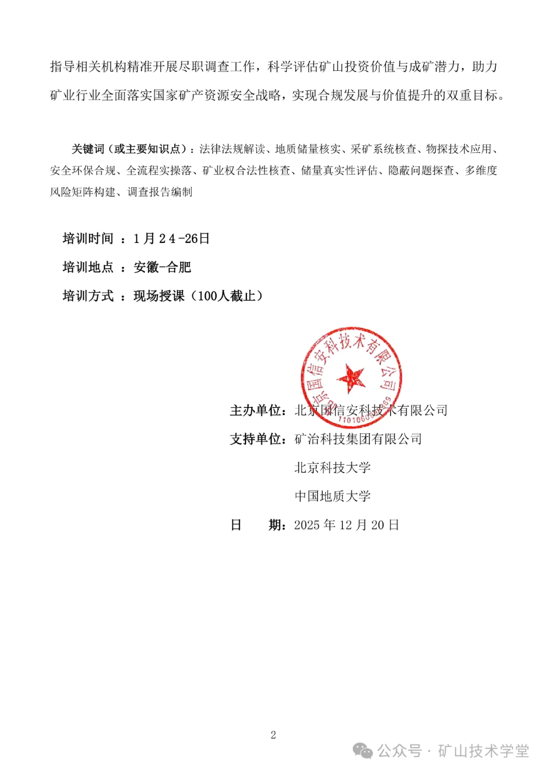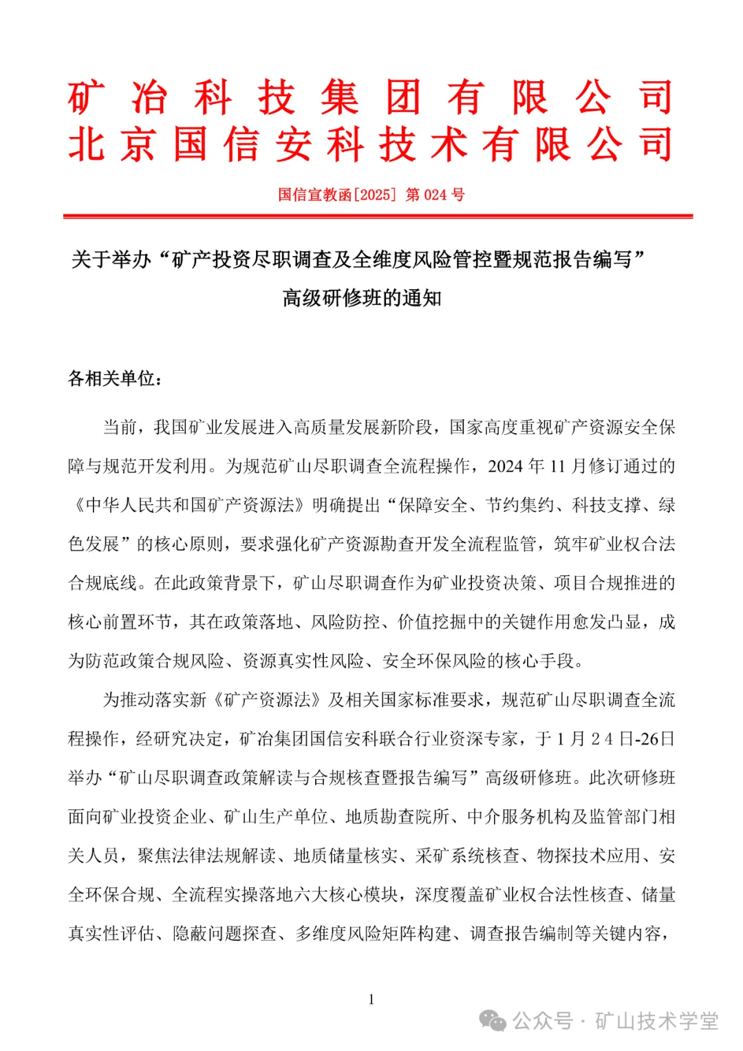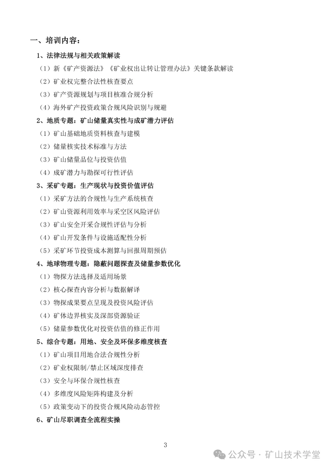 当前,我国矿业发展进入高质量发展新阶段,国家高度重视矿产资源安全保 障与规范开发利用。为规范矿山尽职调查全流程操作,2024 年11 月修订通过的 《中华人民共和国矿产资源法》明确提出“保障安全、节约集约、科技支撑、绿色发展”的核心原则,要求强化矿产资源勘查开发全流程监管,筑牢矿业权合法 合规底线。在此政策背景下,矿山尽职调查作为矿业投资决策、项目合规推进的 核心前置环节,其在政策落地、风险防控、价值挖掘中的关键作用愈发凸显,成 为防范政策合规风险、资源真实性风险、安全环保风险的核心手段。 为推动落实新《矿产资源法》及相关国家标准要求,规范矿山尽职调查全流 程操作,经研究决定,矿冶集团国信安科联合行业资深专家,于1月24日-26日举办“矿山尽职调查政策解读与合规核查暨报告编写”高级研修班。此次研修班 面向矿业投资企业、矿山生产单位、地质勘查院所、中介服务机构及监管部门相关人员,聚焦法律法规解读、地质储量核实、采矿系统核查、物探技术应用、安全环保合规、全流程实操落地六大核心模块,深度覆盖矿业权合法性核查、储量 真实性评估、隐蔽问题探查、多维度风险矩阵构建、调查报告编制等关键内容,2指导相关机构精准开展尽职调查工作,科学评估矿山投资价值与成矿潜力,助力 矿业行业全面落实国家矿产资源安全战略,实现合规发展与价值提升的双重目标。关键词(或主要知识点):法律法规解读、地质储量核实、采矿系统核查、物探技术应用、 安全环保合规、全流程实操落、矿业权合法性核查、储量真实性评估、隐蔽问题探查、多维度 风险矩阵构建、调查报告编制时间:2026年1月24日—26日