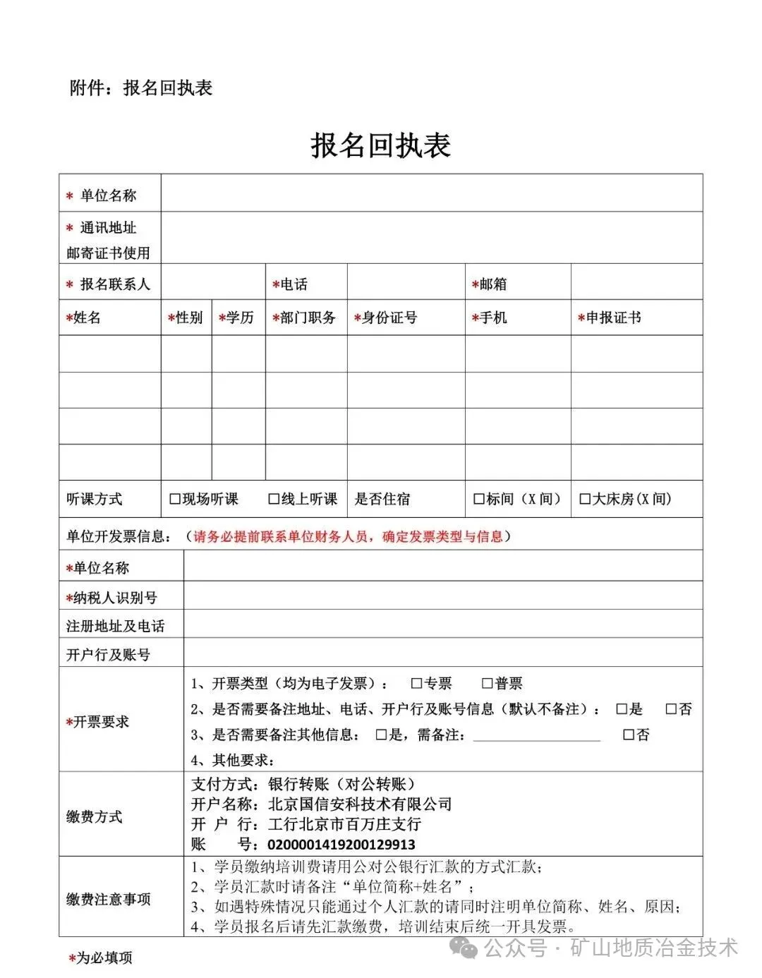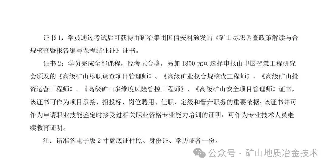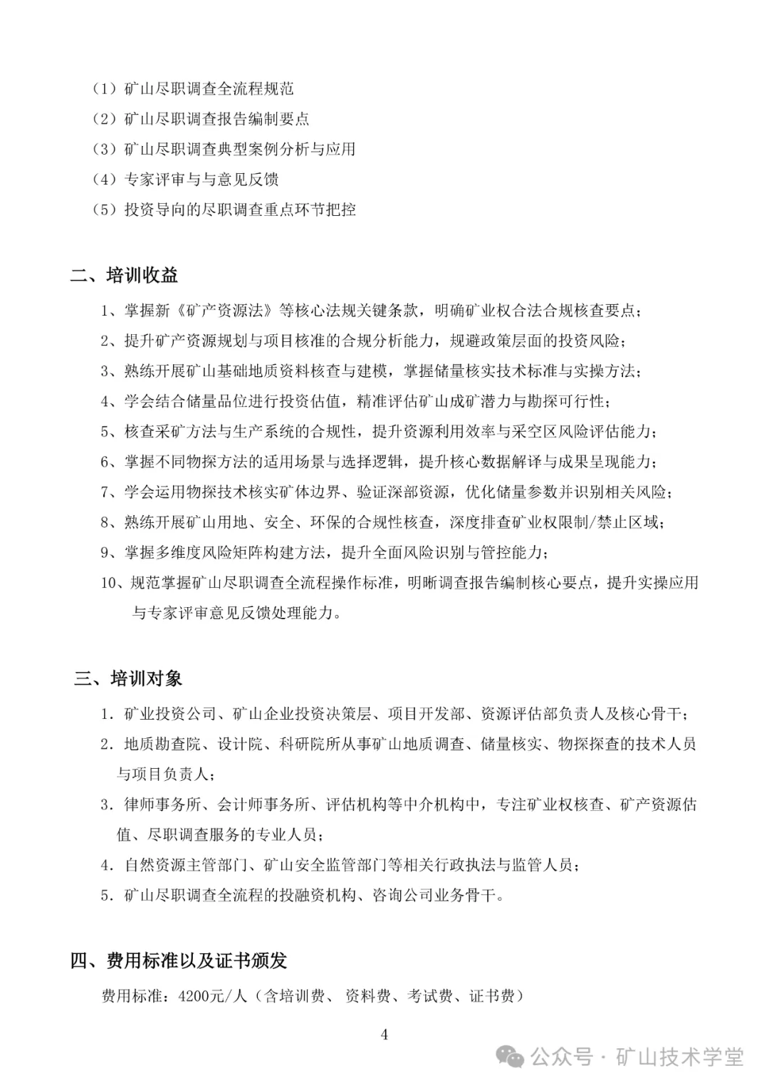 (1)新《矿产资源法》《矿业权出让转让管理办法》关键条款解读 1、掌握新《矿产资源法》等核心法规关键条款,明确矿业权合法合规核查要点; 2、提升矿产资源规划与项目核准的合规分析能力,规避政策层面的投资风险; 3、熟练开展矿山基础地质资料核查与建模,掌握储量核实技术标准与实操方法; 4、学会结合储量品位进行投资估值,精准评估矿山成矿潜力与勘探可行性; 5、核查采矿方法与生产系统的合规性,提升资源利用效率与采空区风险评估能力; 6、掌握不同物探方法的适用场景与选择逻辑,提升核心数据解译与成果呈现能力; 7、学会运用物探技术核实矿体边界、验证深部资源,优化储量参数并识别相关风险; 8、熟练开展矿山用地、安全、环保的合规性核查,深度排查矿业权限制/禁止区域; 9、掌握多维度风险矩阵构建方法,提升全面风险识别与管控能力; 10、规范掌握矿山尽职调查全流程操作标准,明晰调查报告编制核心要点,提升实操应用 与专家评审意见反馈处理能力。1.矿业投资公司、矿山企业投资决策层、项目开发部、资源评估部负责人及核心骨干; 2.地质勘查院、设计院、科研院所从事矿山地质调查、储量核实、物探探查的技术人员 与项目负责人; 3.律师事务所、会计师事务所、评估机构等中介机构中,专注矿业权核查、矿产资源估 值、尽职调查服务的专业人员; 4.自然资源主管部门、矿山安全监管部门等相关行政执法与监管人员; 5.矿山尽职调查全流程的投融资机构、咨询公司业务骨干。费用标准:4200元/人(含培训费、 资料费、考试费、证书费)证书 1:学员通过考试后可获得由矿冶集团国信安科颁发的《矿山尽职调查政策解读与合 规核查暨报告编写课程结业证》证书。 证书 2:学员完成全部课程,经考试合格,另加 1800 元可选择申报由中国智慧工程研究 会颁发的《高级矿山尽职调查项目管理师》、《高级矿业权合规核查工程师》、《高级矿山投 资运营工程师》、《高级矿山多维度风险管控工程师》、《高级矿山安全项目管理师》证书, 该证书可作为项目承接、招投标、岗位聘用、任职、定级和晋升职务的重要依据;该证书并可 作为申请职业技能鉴定时接受过相关职业资格专业能力培训的证明;可作为专业技术人员继 续教育证明。 注:请准备电子版 2 寸蓝底证件照、身份证、学历证各一份。1、会务联系