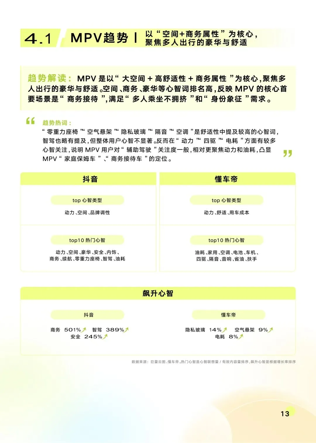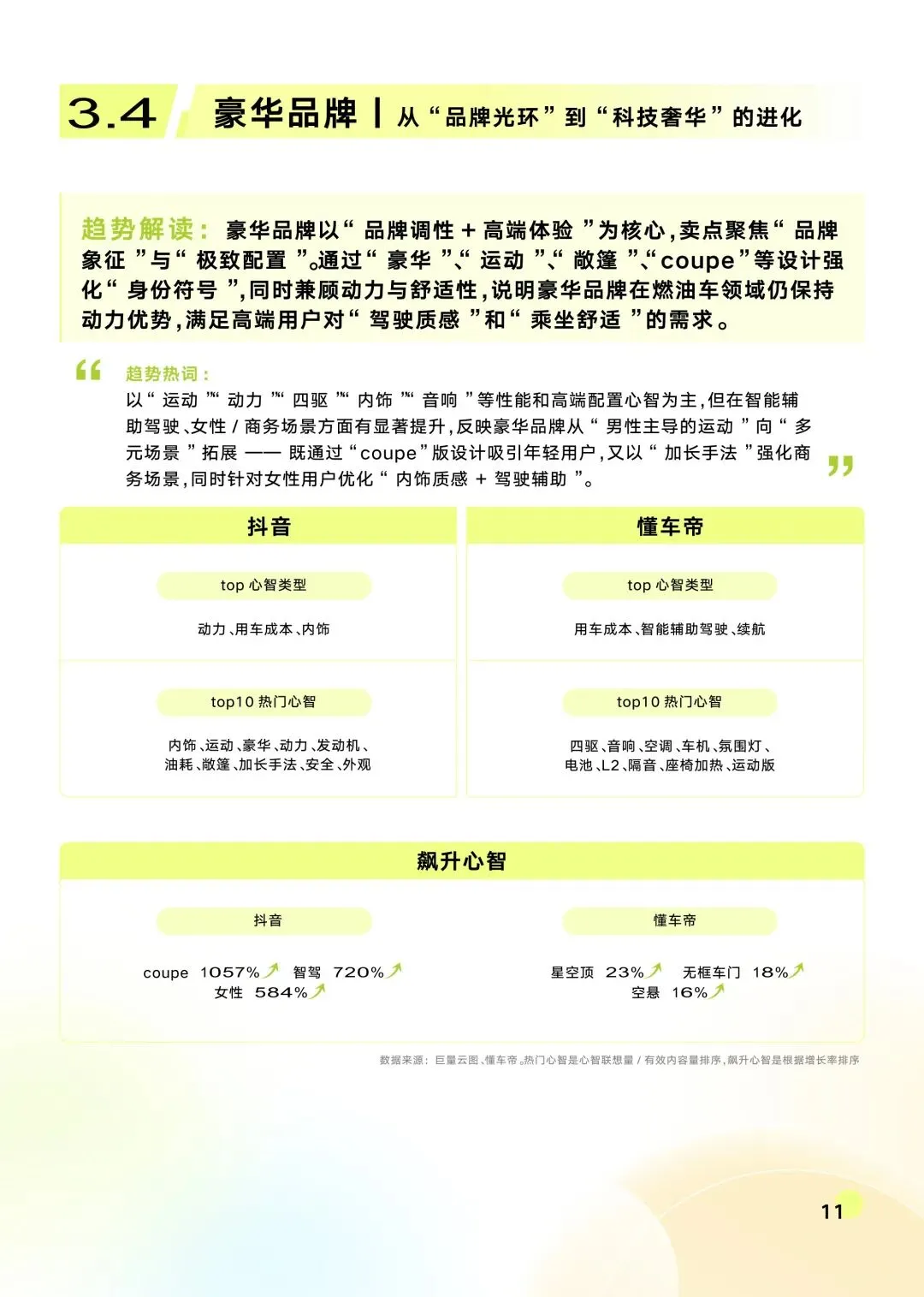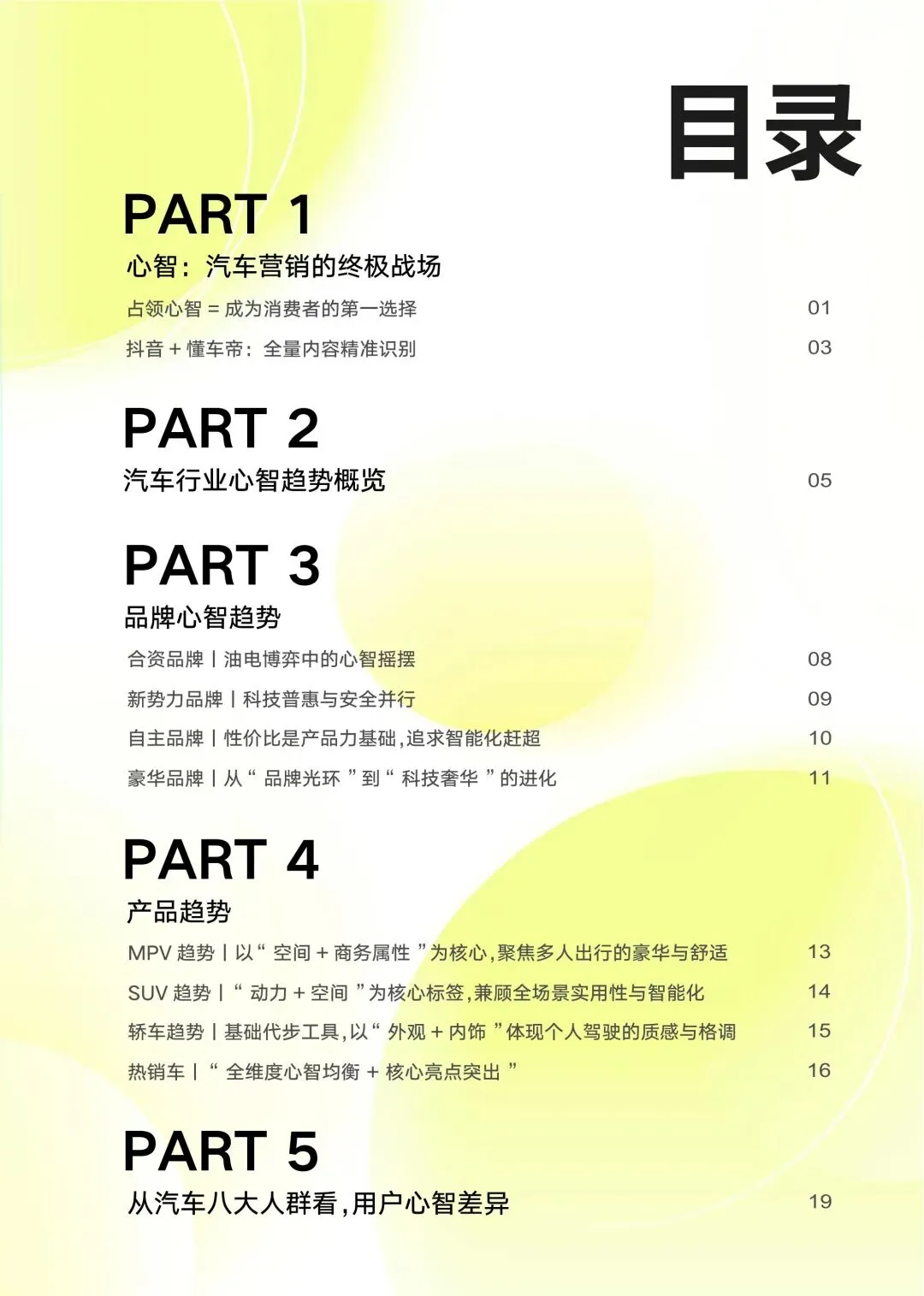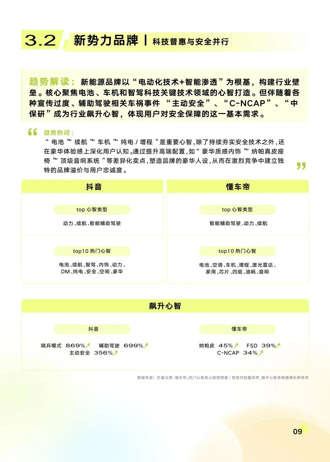 心智与销量强关联,智能化成红海竞争焦点:用户心智(品牌、场景、产品)与销量呈强相关性,其中产品心智对销量贡献占比达 53%。行业需求从传统性能(发动机、操控)转向智能化(辅助驾驶、自动泊车),但智能技术已成为标配,如何在保障安全的前提下实现技术差异化,成为车企竞争关键。抖音、懂车帝数据显示,“激光雷达”“辅助驾驶” 既是热门心智也是飙升心智,竞争白热化。 不同品牌心智差异化显著:合资品牌处于 “燃油转新能源” 认知重构期,热门心智仍集中于油耗、动力等传统领域,同时加速布局 “油混”“增程” 技术;新势力品牌以电池、车机、智驾为核心,“主动安全”“C-NCAP” 等心智飙升,凸显用户对安全的关注;自主品牌坚守性价比,同时推动 “10 万级标配智能辅助驾驶”;豪华品牌从 “品牌光环” 转向 “科技奢华”,拓展女性、商务等多元场景。 产品细分市场心智焦点清晰:MPV 以 “空间 + 商务属性” 为核心,“零重力座椅”“隐私玻璃” 等舒适性心智突出;SUV 聚焦 “动力 + 空间”,同时延伸出豪华、越野、智能等细分方向,“车载无人机” 等场景化心智增长显著;轿车作为基础代步工具,以 “外观 + 内饰” 体现质感,“coupe”“丝滑” 等驾驶体验类心智飙升;热销车呈现 “全维度均衡 + 核心亮点突出”,价位段越高,用户越愿意为技术与品牌溢价买单。 价格段心智呈现阶梯式升级:10 万级车型聚焦实用与基础功能,以动力、内饰、家用等心智为核心,性价比是关键;20 万级在基础功能之外,强化舒适性、续航与户外场景适配,科技与体验升级;30 万级凸显高端科技与奢华感,三电系统、智驾、品牌调性成为核心心智,用户更注重身份彰显与自我表达。不同价位段热销车的心智差异,反映消费需求从 “基础满足” 到 “体验溢价” 的升级。 八大人群心智偏好差异明显:“生活精算师”(三到五线城市中青年)优先关注油耗、动力;“摩登青年客”(高线城市年轻人)看重内饰、外观与安全;“潮奢精质族”(高线城市成熟青年)聚焦智驾、电池与内饰质感;“温馨生活家”(女性为主)偏好纯电、安全、续航;“科技先锋派”(高线城市科技爱好者)关注智驾、电池与技术指标;“野趣体验官”(低线城市已婚育群体)重视四驱、发动机与越野性能,人群差异为车企精准营销提供依据。