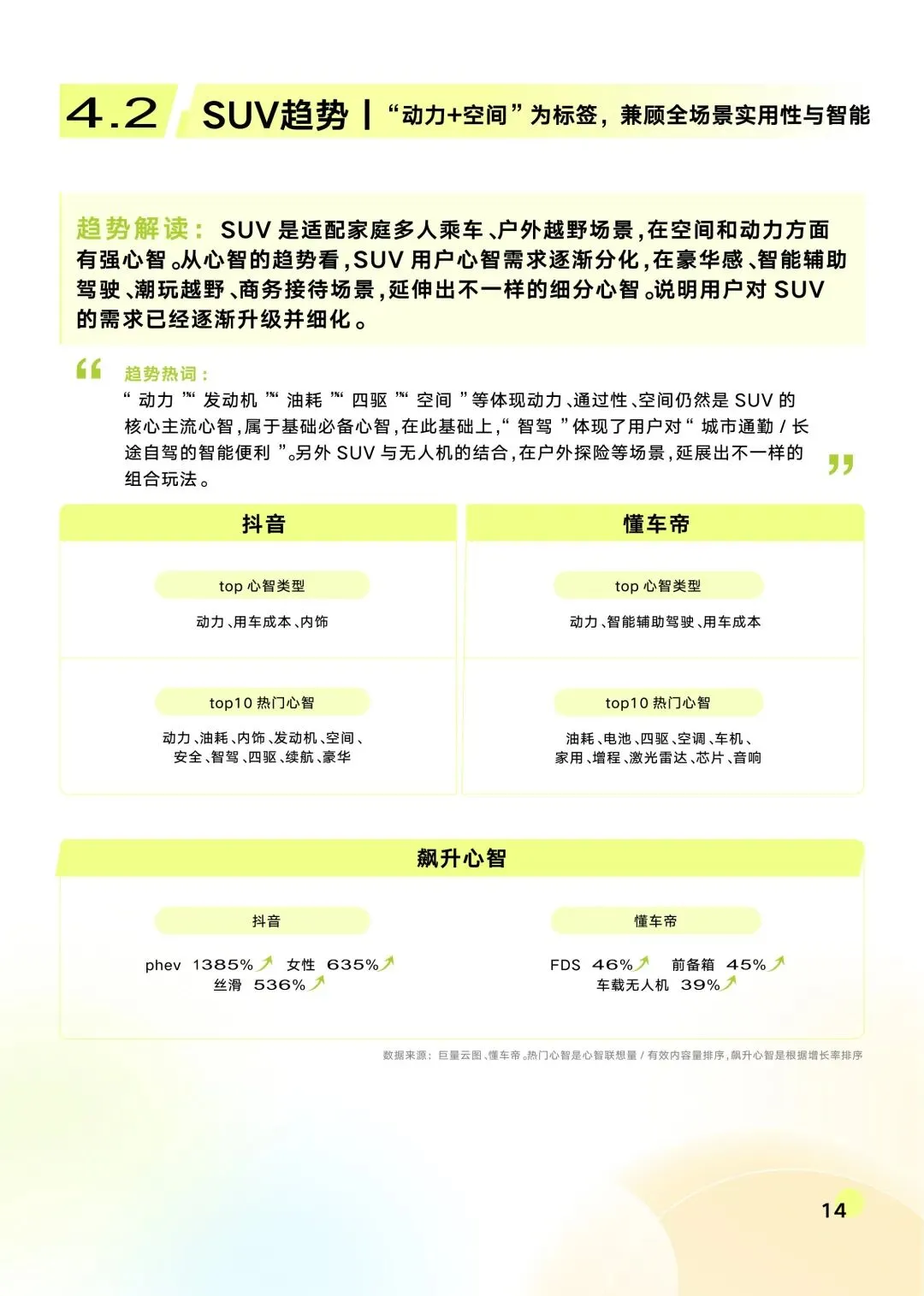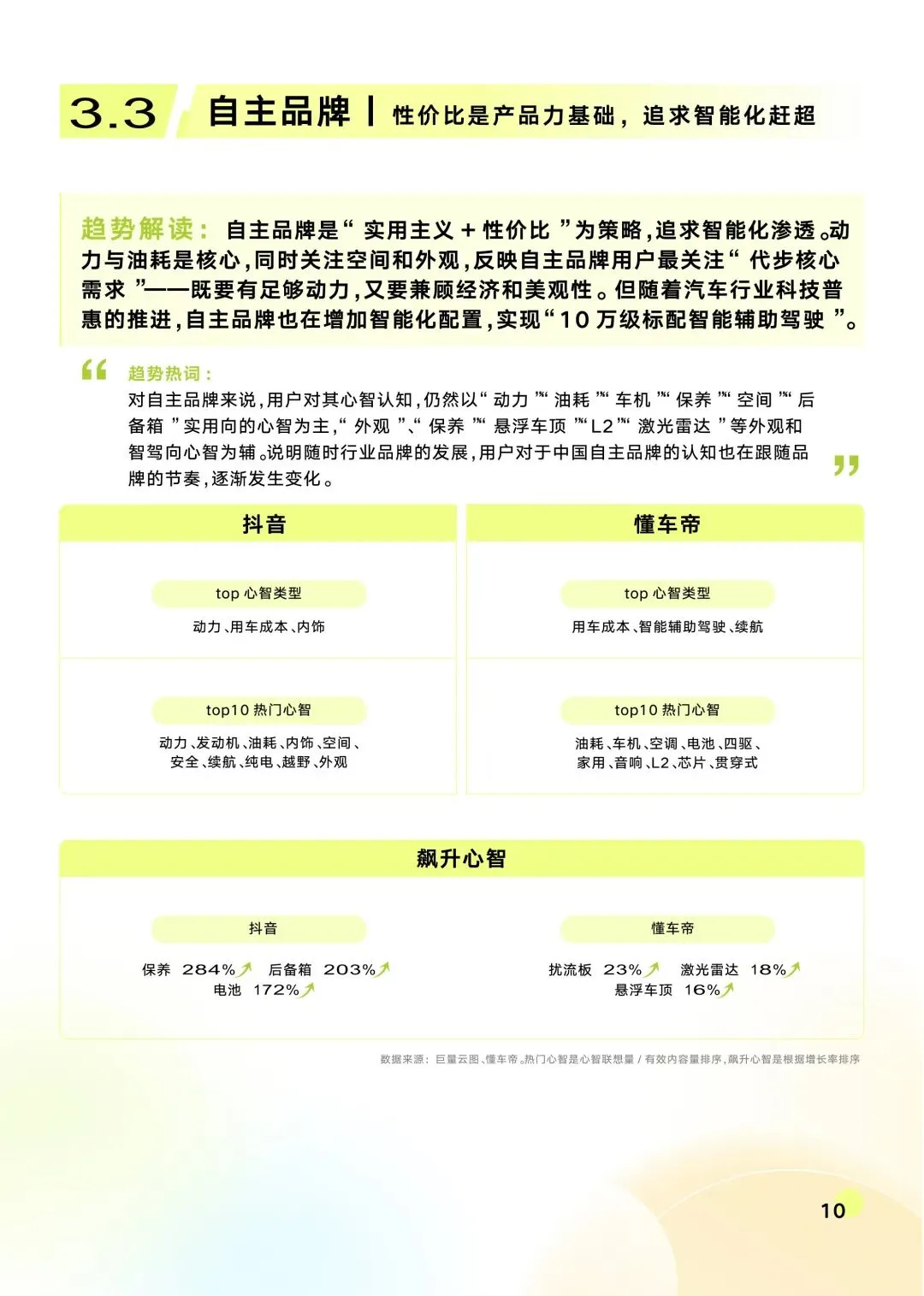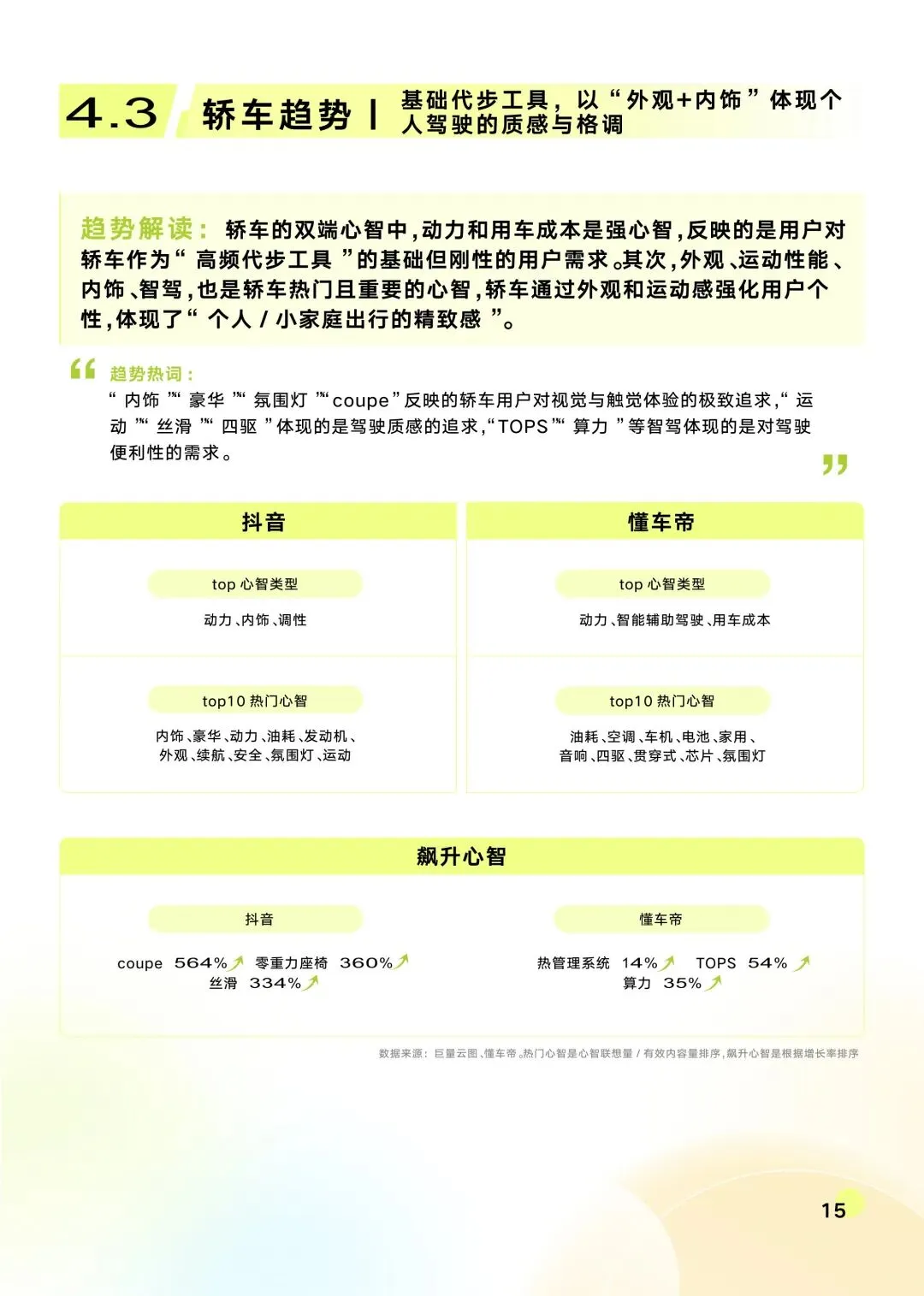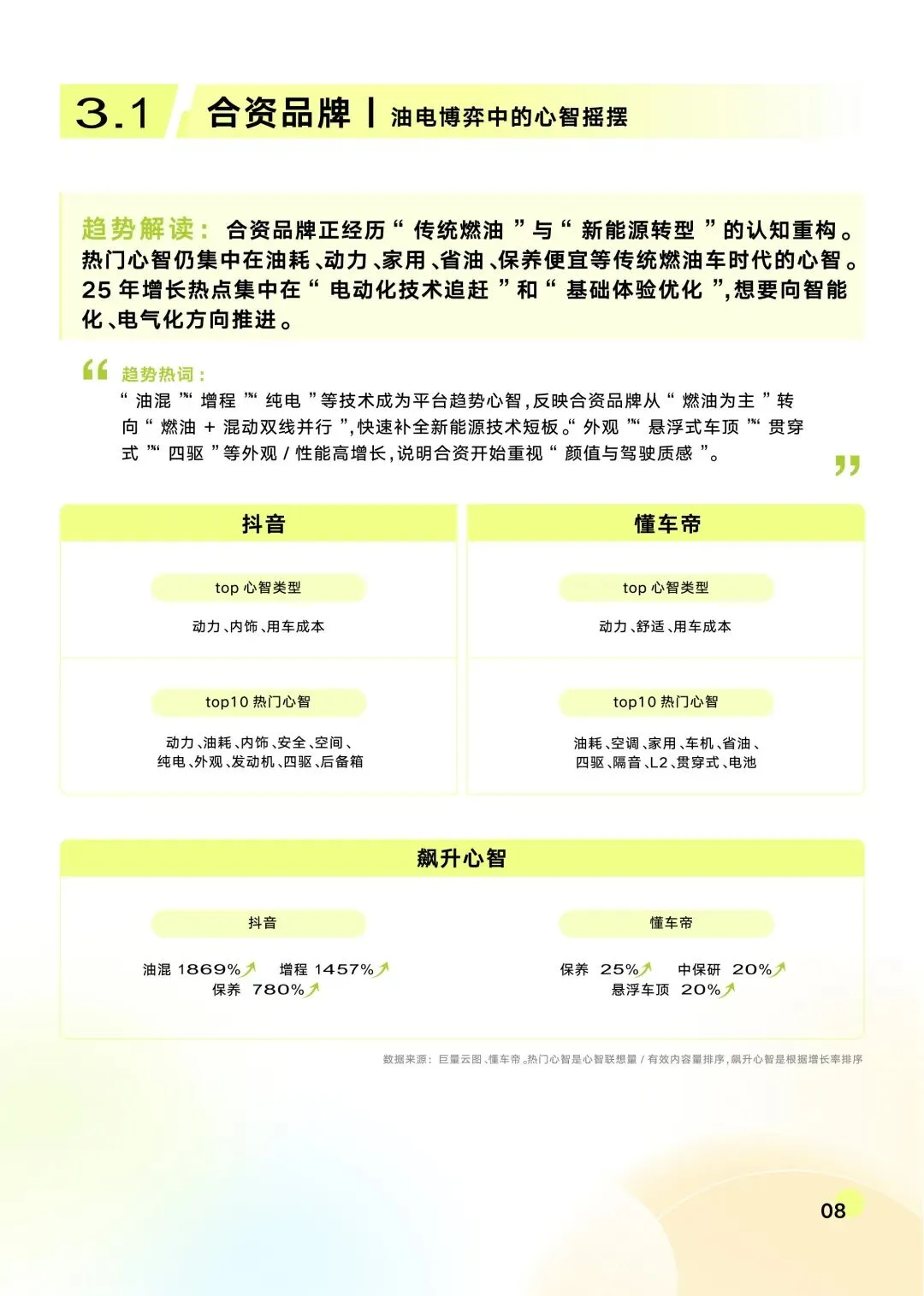 心智与销量强关联,智能化成红海竞争焦点:用户心智(品牌、场景、产品)与销量呈强相关性,其中产品心智对销量贡献占比达 53%。行业需求从传统性能(发动机、操控)转向智能化(辅助驾驶、自动泊车),但智能技术已成为标配,如何在保障安全的前提下实现技术差异化,成为车企竞争关键。抖音、懂车帝数据显示,“激光雷达”“辅助驾驶” 既是热门心智也是飙升心智,竞争白热化。 不同品牌心智差异化显著:合资品牌处于 “燃油转新能源” 认知重构期,热门心智仍集中于油耗、动力等传统领域,同时加速布局 “油混”“增程” 技术;新势力品牌以电池、车机、智驾为核心,“主动安全”“C-NCAP” 等心智飙升,凸显用户对安全的关注;自主品牌坚守性价比,同时推动 “10 万级标配智能辅助驾驶”;豪华品牌从 “品牌光环” 转向 “科技奢华”,拓展女性、商务等多元场景。 产品细分市场心智焦点清晰:MPV 以 “空间 + 商务属性” 为核心,“零重力座椅”“隐私玻璃” 等舒适性心智突出;SUV 聚焦 “动力 + 空间”,同时延伸出豪华、越野、智能等细分方向,“车载无人机” 等场景化心智增长显著;轿车作为基础代步工具,以 “外观 + 内饰” 体现质感,“coupe”“丝滑” 等驾驶体验类心智飙升;热销车呈现 “全维度均衡 + 核心亮点突出”,价位段越高,用户越愿意为技术与品牌溢价买单。 价格段心智呈现阶梯式升级:10 万级车型聚焦实用与基础功能,以动力、内饰、家用等心智为核心,性价比是关键;20 万级在基础功能之外,强化舒适性、续航与户外场景适配,科技与体验升级;30 万级凸显高端科技与奢华感,三电系统、智驾、品牌调性成为核心心智,用户更注重身份彰显与自我表达。不同价位段热销车的心智差异,反映消费需求从 “基础满足” 到 “体验溢价” 的升级。 八大人群心智偏好差异明显:“生活精算师”(三到五线城市中青年)优先关注油耗、动力;“摩登青年客”(高线城市年轻人)看重内饰、外观与安全;“潮奢精质族”(高线城市成熟青年)聚焦智驾、电池与内饰质感;“温馨生活家”(女性为主)偏好纯电、安全、续航;“科技先锋派”(高线城市科技爱好者)关注智驾、电池与技术指标;“野趣体验官”(低线城市已婚育群体)重视四驱、发动机与越野性能,人群差异为车企精准营销提供依据。