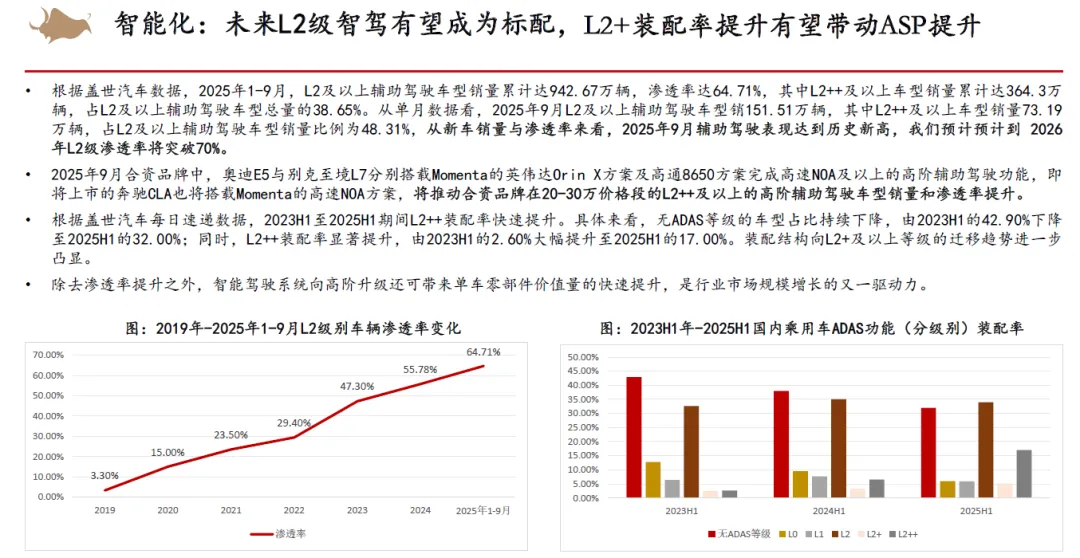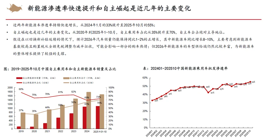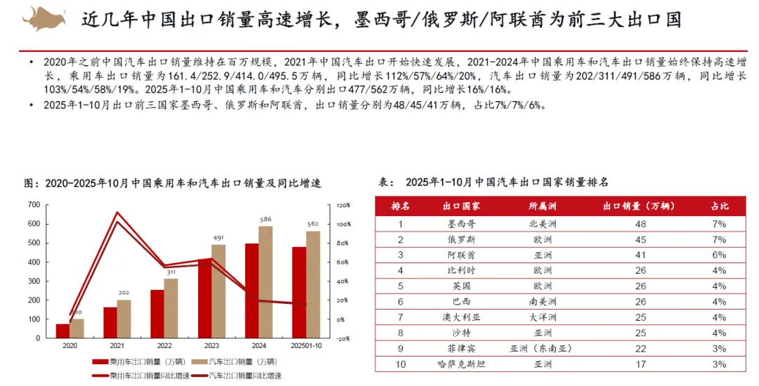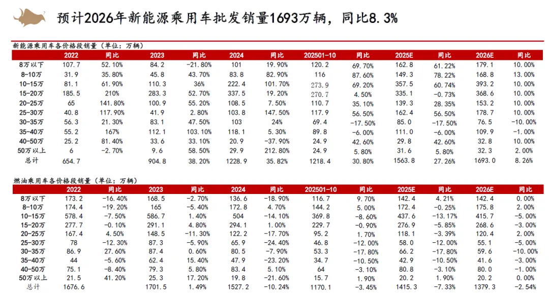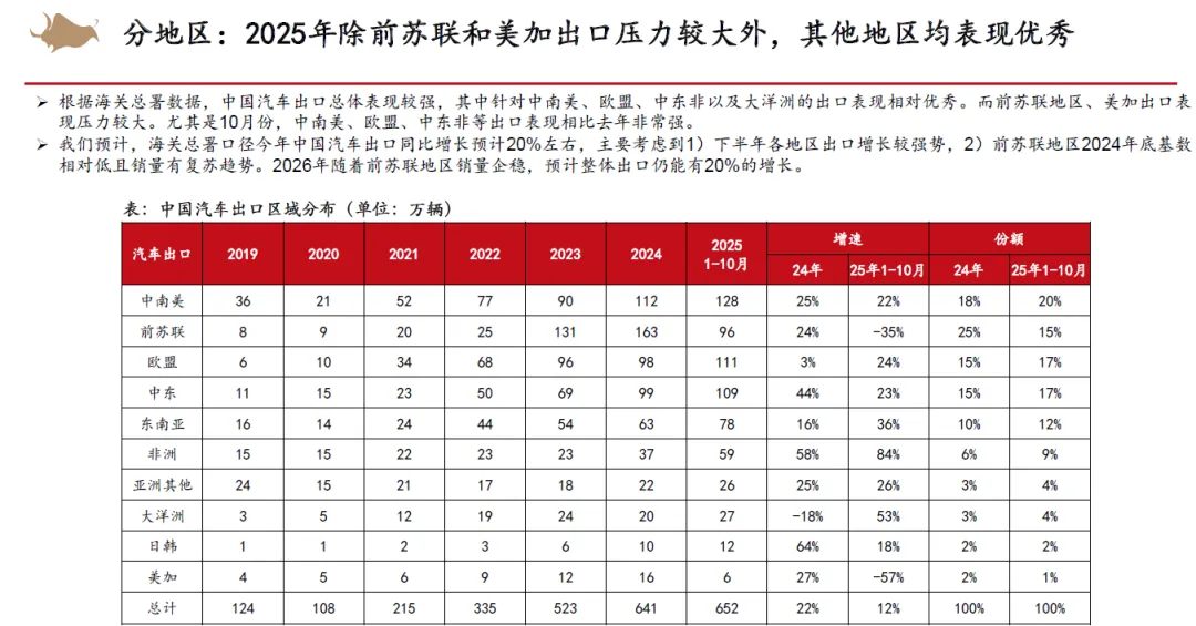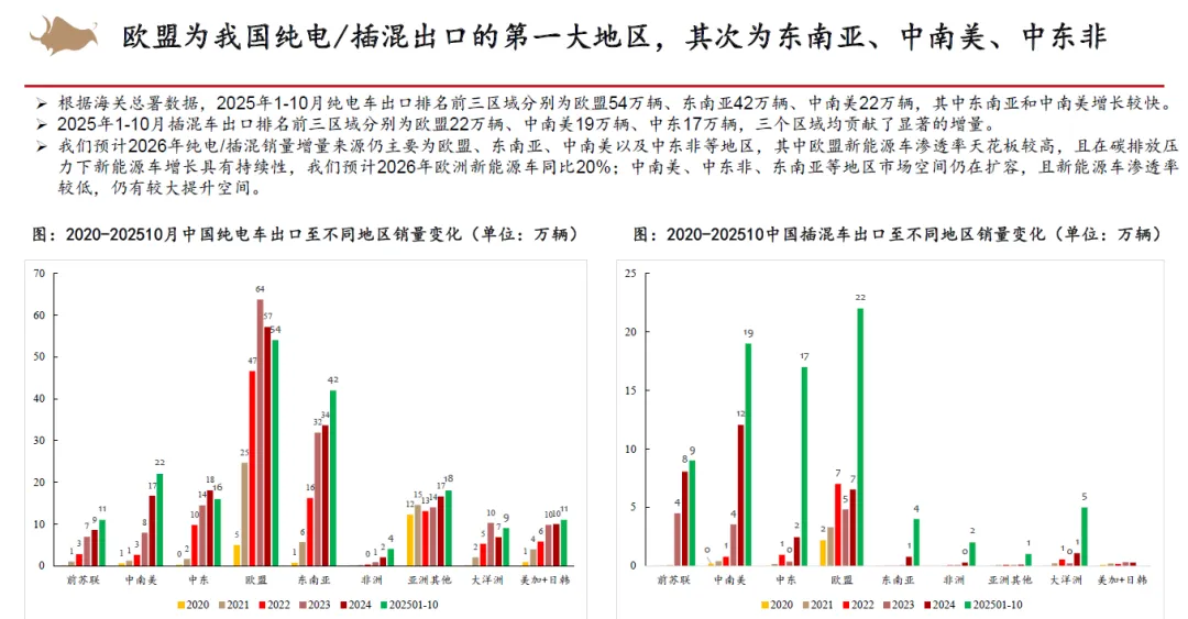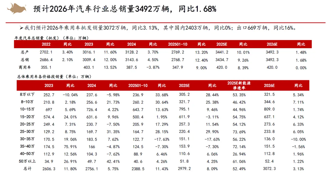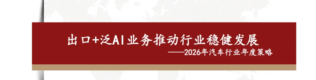 从整车竞争来看,认为2026年以旧换新补贴不排除金额下降,同时叠加新能源车购置税补贴从10%降低至5%,市场竞争将会更加激烈。但新能源优质供给继续增加,我们依然看好新能源车渗透率继续提升。2025年15万以下价格带销量快速增长,在当前时点,我们认为其增长趋势在2026年补贴减少的状态下或有一定的不确定性,而中高价格带则在2026年有望随着宏观经济和消费复苏稳健增长。同时,我们认为2025年整车出口好于预期,新能源车出口高增,海外丰厚的利润也为国内车企的盈利提升提供动力。展望2026,欧洲、俄罗斯、巴西、中东、北非等地区依然具有增长潜力,我们认为国内车企的海外销量增长还能够维持。