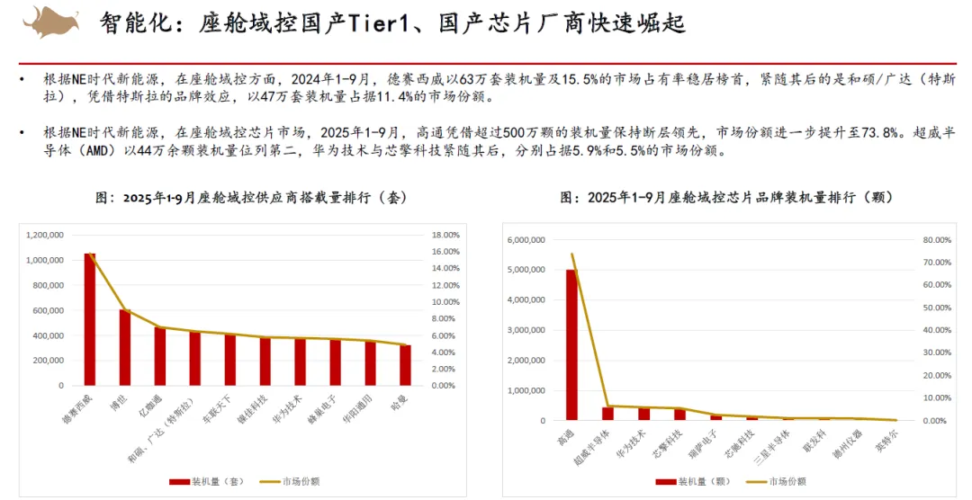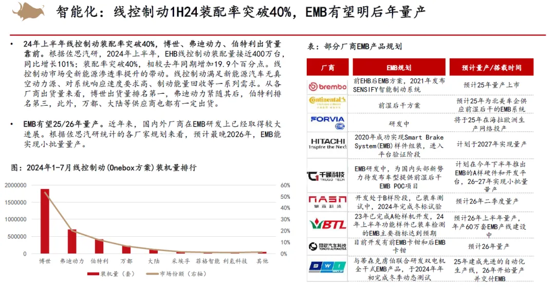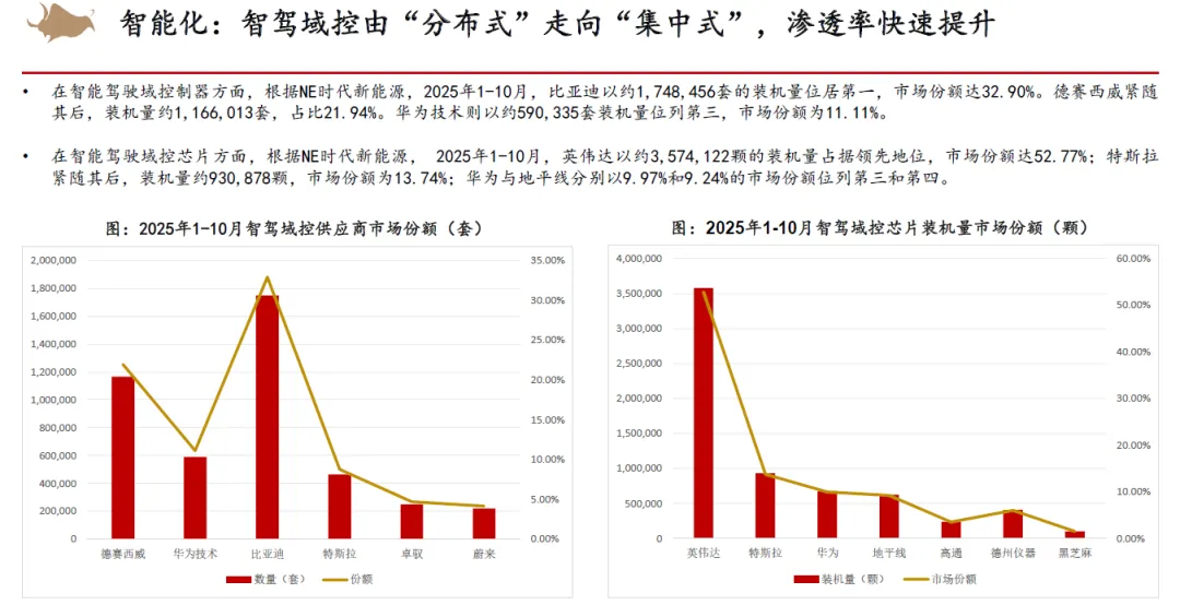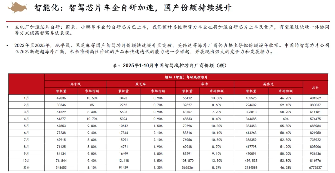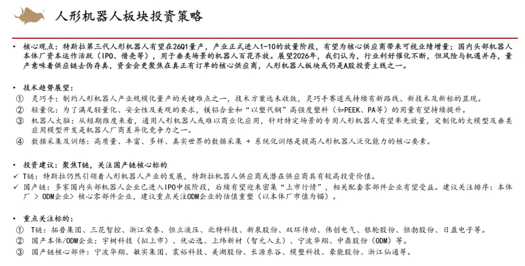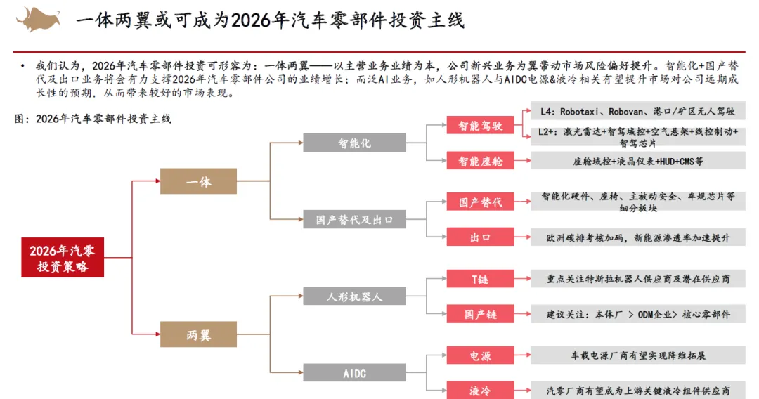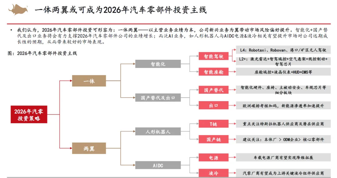 零部件方面,我们认为智能化渗透率将会继续高增,同时出口业务的高增长+国产替代加速有望在2026年的市场环境下为零部件企业的业绩增长提供强劲支撑,国产车规芯片有望大规模开始量产。而人形机器人或AIDC液冷&服务电源业务也有望为零部件企业开拓新蓝海,在业务拓展的同时,资本市场也有望为龙头企业提供一定的估值溢价。