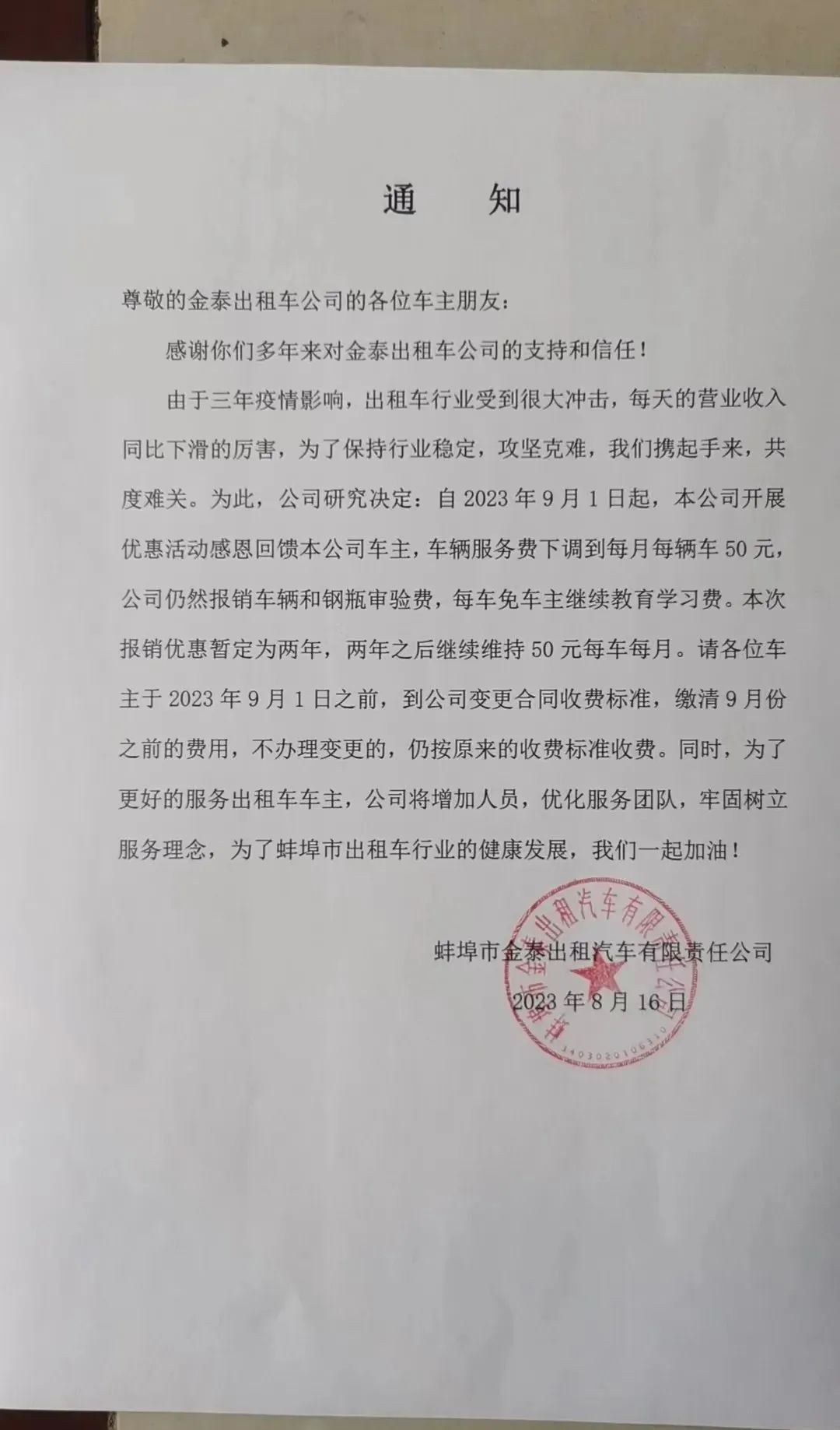 8月16日,安徽省蚌埠市金泰出租车有限责任公司向全体出租车驾驶员发布通知,内容如下: