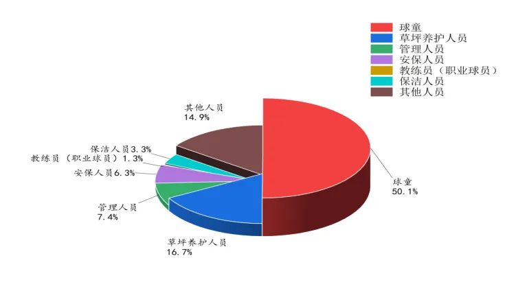 高尔夫球产业链条长、业态多,对就业的拉动作用明显,是体育服务业中人力资源吸纳能力较强的细分领域之一。在球场运营方面,我国每座高尔夫球场(每个18洞球场)平均提供198个直接就业岗位,目前全国高尔夫球场提供岗位数约6.7万个,涵盖运营管理、草坪养护、教学服务、安全保障、清洁维护等。其中,球童占比最高,达50.1%,其次为草坪养护人员(16.7%)、管理人员(7.4%)、安保人员(6.3%)、保洁人员(3.0%)、教练员(职业球员)(1.0%),其余岗位合计占比15.0%。此外,通过实地走访与访谈发现,球场就业人员的来源主要是本地居民,普遍学历不高。可见高尔夫球场能够极大地促进本地居民就业,促进社会稳定。
