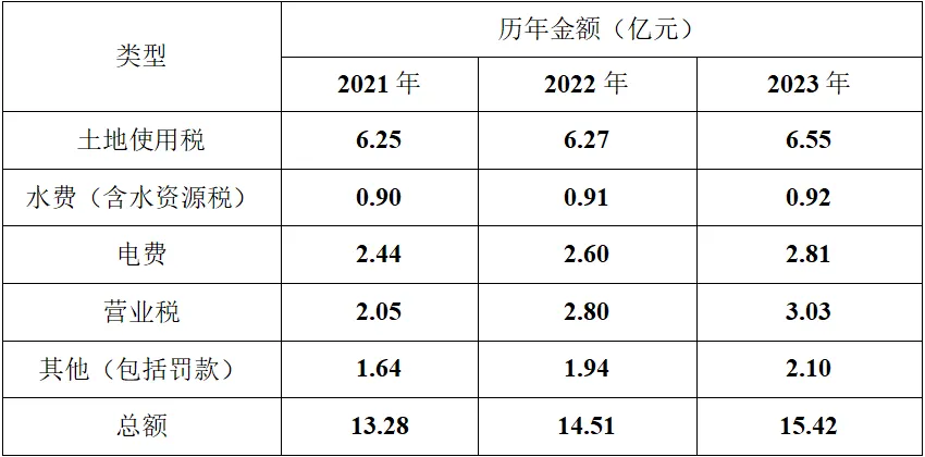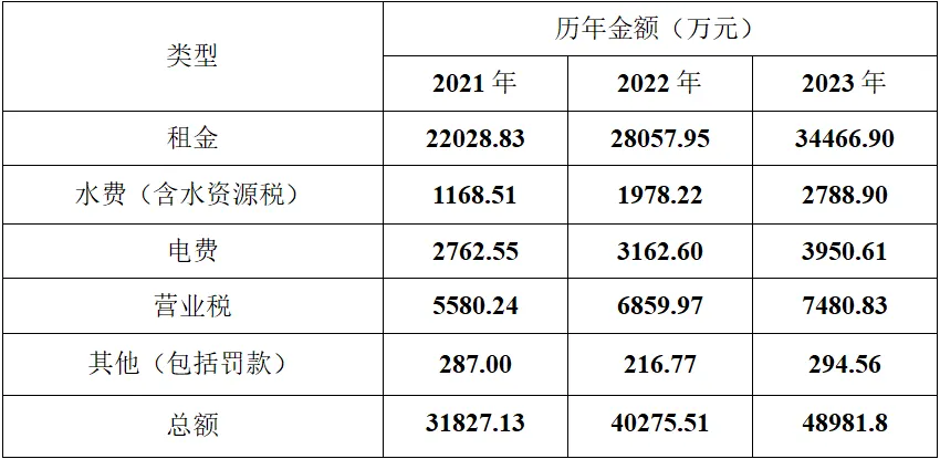 从2023年税费构成看,租金支出为最大项,约3.45亿元,占总税费支出的70.4%;其次为营业税、电费、水费(含水资源税)等常规经营税费;税费占比最低的是“其他”项目(含罚款等),仅为294.56万元,占比不足1%,反映整体经营合规性良好。