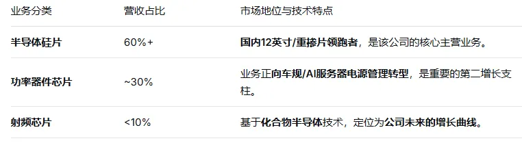 今天分析列表中的立昂微。立昂微是中国半导体领域极少数拥有“自有粮仓”的 IDM(垂直整合制造) 厂商。其本质并非单纯的芯片设计公司,而是横跨“半导体硅片(材料)+ 功率器件(芯片)+ 化合物半导体(射频)”三大板块的产业链一体化平台