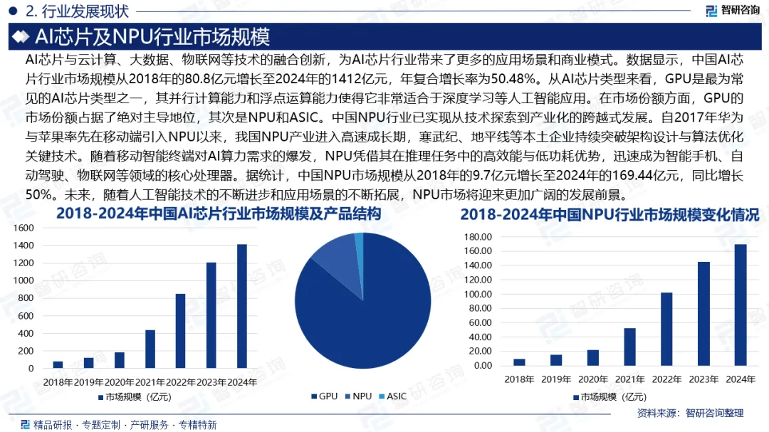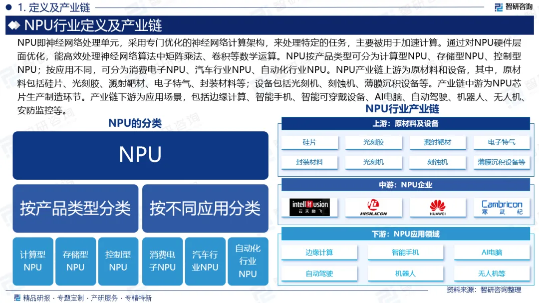 NPU即神经网络处理单元,采用专门优化的神经网络计算架构,来处理特定的任务,主要被用于加速计算。通过对NPU硬件层面优化,能高效处理神经网络算法中矩阵乘法、卷积等数学运算。NPU按产品类型可分为计算型NPU、存储型NPU、控制型NPU;按应用不同,可分为消费电子NPU、汽车行业NPU、自动化行业NPU。中国NPU行业已实现从技术探索到产业化的跨越式发展。自2017年华为与苹果率先在移动端引入NPU以来,我国NPU产业进入高速成长期,寒武纪、地平线等本土企业持续突破架构设计与算法优化关键技术。随着移动智能终端对AI算力需求的爆发,NPU凭借其在推理任务中的高效能与低功耗优势,迅速成为智能手机、自动驾驶、物联网等领域的核心处理器。据统计,中国NPU市场规模从2018年的9.7亿元增长至2024年的169.44亿元,同比增长50%。未来,随着人工智能技术的不断进步和应用场景的不断拓展,NPU市场将迎来更加广阔的发展前景。全球NPU行业已形成多层次竞争格局,国际厂商与国内企业共同构建起多元化市场生态。目前全球市场主要由英伟达、英特尔、高通、谷歌、苹果、三星等跨国科技企业主导,同时西门子、微软、ARM及Hailo等专业厂商在特定领域亦占据重要地位。中国NPU产业近年来发展迅速,已涌现出以华为海思、寒武纪、地平线为代表的国内优势企业,爱芯元智、燧原科技、昆仑万维等创新力量也在加速布局,共同推动着国产NPU技术迭代与产业生态完善。整体来看,全球NPU市场呈现国际巨头技术领先与国内企业快速追赶并存的竞争态势。