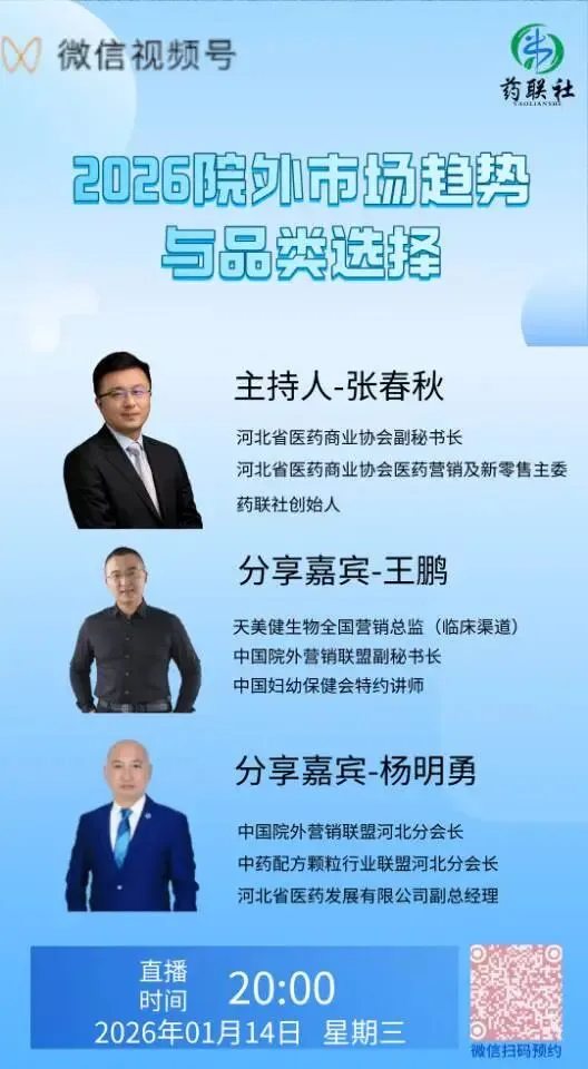 为助力医药从业者把握2026年院外市场发展脉络、精准做好品类布局决策,药联社特举办2026院外市场趋势与品类选择线上直播分享会,诚邀行业专家分享前沿观点与实战经验,具体事宜通知如下: