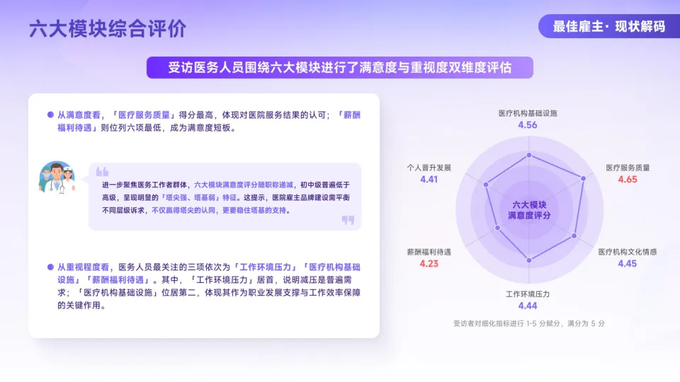 - 最不满意:薪酬福利待遇(4.19分),是六大模块中得分最低的。尤其是医生岗位,满意度仅为4.16分。