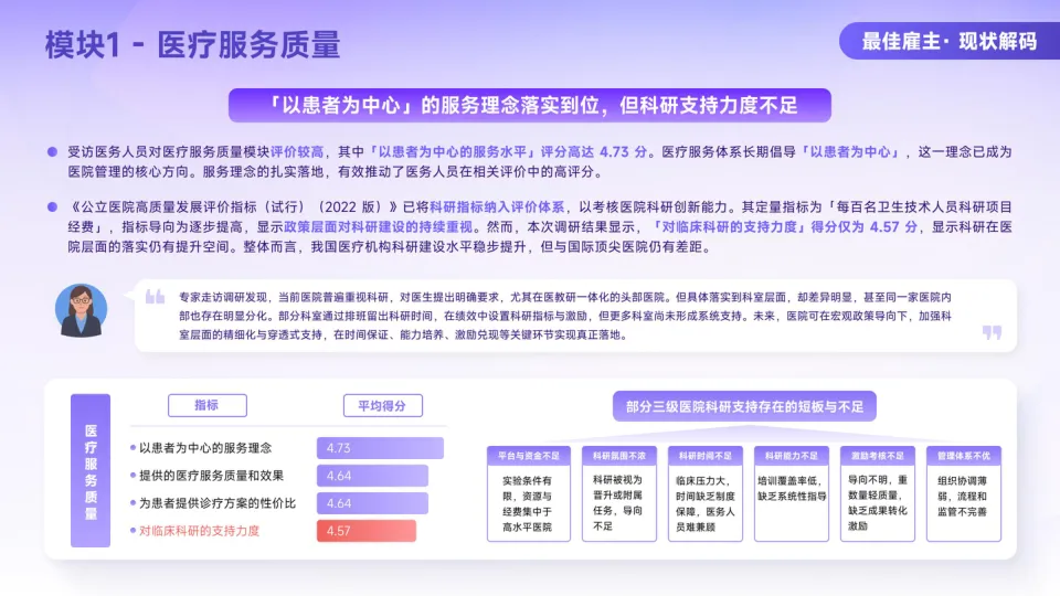 - 虽然政策要求医院加强科研,但一线反馈“科研支持力度不足”(4.57分)。