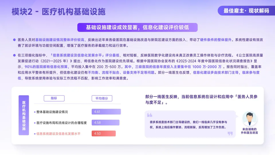 - 医院基础设施:虽然硬件整体不错,但信息系统(HIS系统等)体验差,很多是技术部门闭门造车,一线医护用起来很别扭,反而增加了负担。
