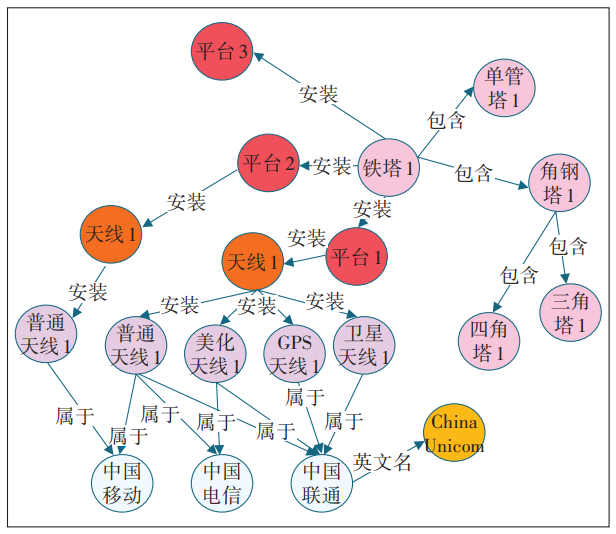 构建知识图谱需要先确定本体,继而构建对应的实体和关系以及属性。知识图谱的基本组成单位是“实体-关系-实体”三元组,以及实体的相关属性,实体间通过关系相互联结,构成网状。知识图谱中的本体是指对实体、属性和关系进行分类和定义的一种形式化描述方法,它可以帮助机器理解和处理知识。知识图谱中的实体指具有独立存在和特定属性的事物,如人、地点、组织、事件等。关系就是指实体之间的联系,如人与组织之间的工作关系、人与人之间的社交关系等。属性指的是描述实体的特征或属性,如人的姓名、年龄、性别等。三元组是指由实体、属性和关系组成的基本单元,如图1所示,天线、铁塔、平台都是构建的本体,天线1、平台1、铁塔1等为对应的实体。安装、属于、包含均为关系,GPS天线1-属于-中国联通则可成为三元组,中国联通的英文名属于实体的相关属性。