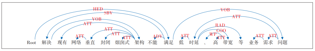 b)基于依存句法分析的候选词筛选。由于中文文本成分复杂,使用单一的词性正则表达式提取动词、名词短语往往会提取到错误的短语,降低准确率。基于此情况,对候选关键词进行依存句法分析,对含有主谓、动宾、介宾等关系的候选词进行筛选,以删除不合理的候选短语,提高候选关键词质量。依存句法示意如图3所示。