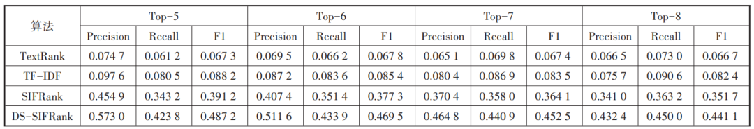可以看出,DS-SIFRANK算法在垂直领域下各项指标上优于现有的无监督实体信息抽取算法。
