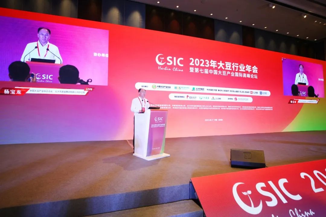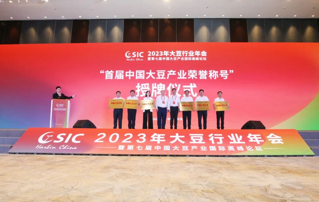南华期货产业发展委员会委员、中国大豆产业协会执行会长、黑龙江省大豆协会会长唐启军,中国大豆产业协会副会长、北大荒农垦集团党委委员、副总经理唐浩为获得首届中国大豆产业荣誉称号的单位授牌。杨宝龙在作主旨演讲时表示,第七届中国大豆产业国际高峰论坛如期召开,共研中国大豆产业面临的新形势新挑战,共谋中国大豆产业发展的新方向新路径,共同探讨中国大豆产业发展的方向和未来,为探索加强国产大豆加工企业和基地的连接、强化全链条主体与金融的融合、提升风险管控水平、提高科技能力提供可借鉴经验,将有力推动大豆产业从粗加工向精加工转型,从传统营销向品牌化营销转变,从传统生产向数字化智能化生产转型,进一步强化差异化品牌运营能力。杨宝龙表示,中国大豆产业协会将与各位业内同行共同携手贯彻新发展理念,努力构建中国大豆产业发展新格局,为中国大豆产业振兴作出新贡献。此次活动由中国大豆产业协会、黑龙江省大豆协会、北大荒集团、海伦市委市政府、克山县委县政府、九三粮油工业集团有限公司、南华期货股份有限公司主办,黑龙江省农业投资集团有限公司、中粮贸易有限公司、九三分公司、北大荒融媒体发展有限公司等单位协办。来自全国各地的大豆种业公司、种植企业、贸易流通企业、加工企业、主产区政府部门的800余名嘉宾参加了活动。活动中,中国民生银行首席经济学家兼研究院院长温彬等嘉宾围绕当前中国与全球宏观经济分析与展望等内容作主题演讲,与会嘉宾围绕中国大豆产业创新发展路径、2023年新季大豆市场格局变化及价格进行了探讨和展望。同时,山东省禹城市、克山县以及赵光、鹤山、八五五农场荣获“中国大豆之乡”荣誉称号,海伦市荣获“中国大豆名城”的荣誉称号。出品:北大荒九三粮油