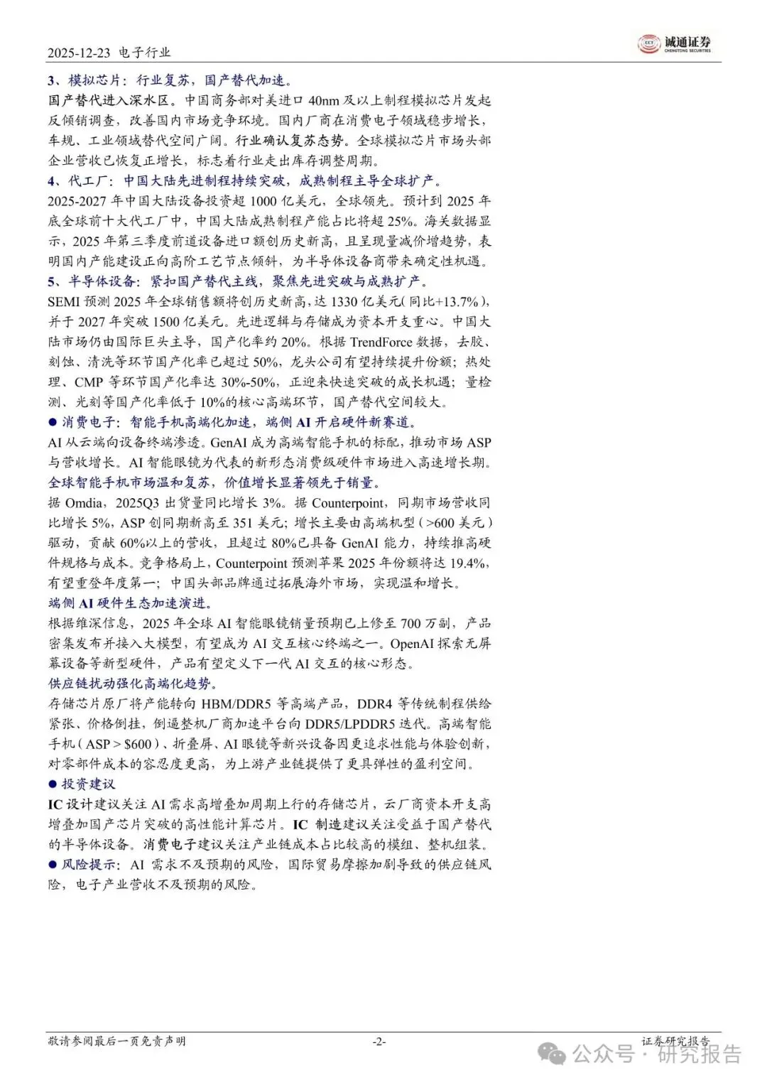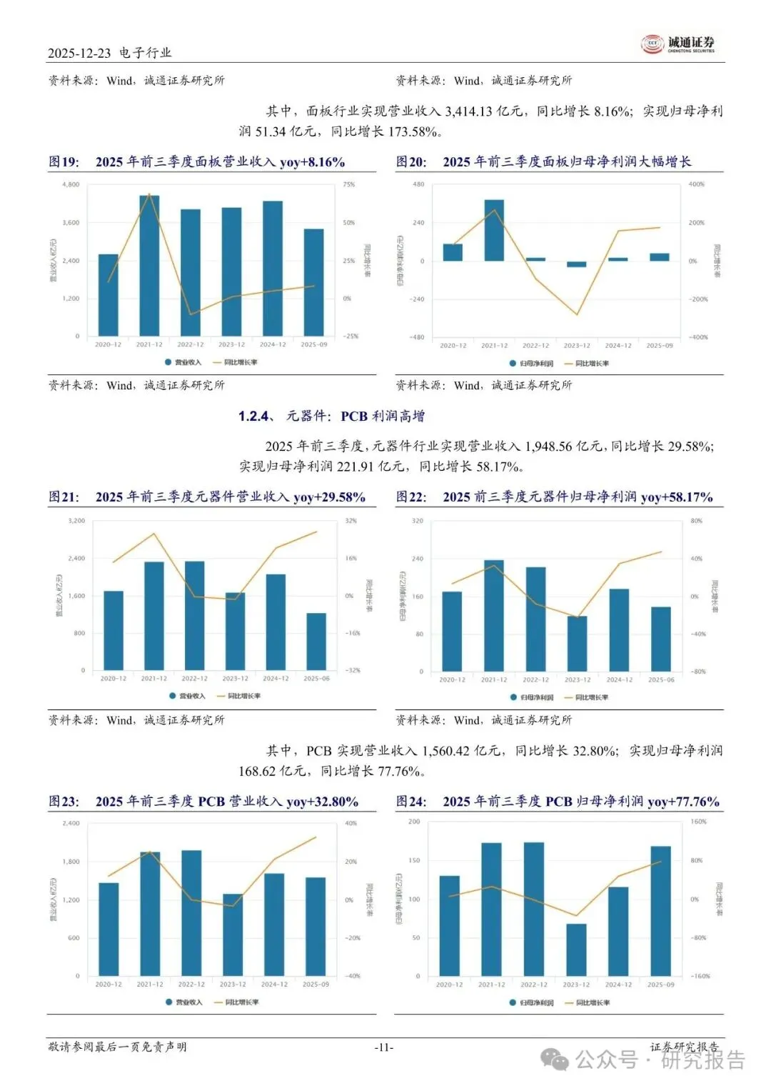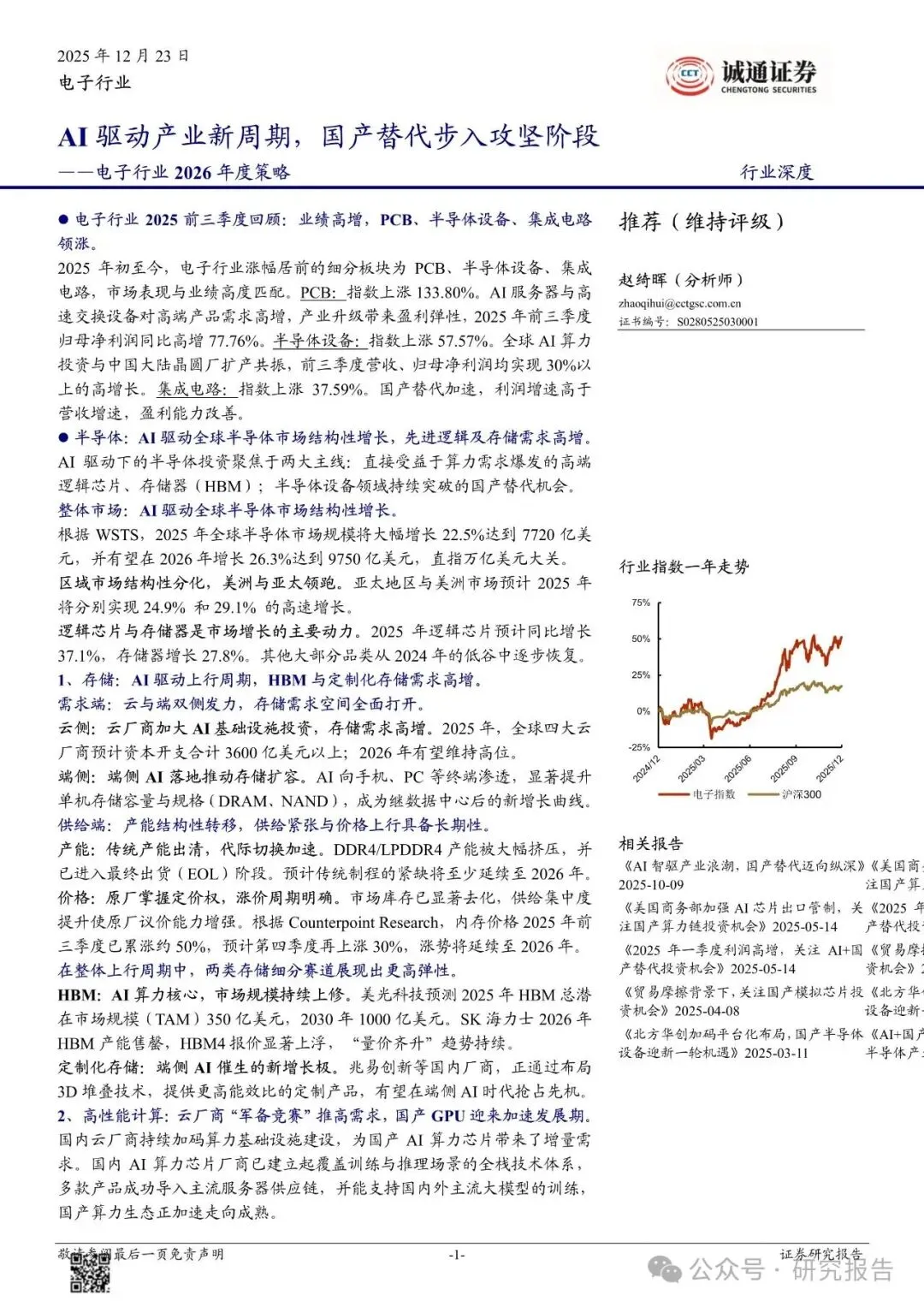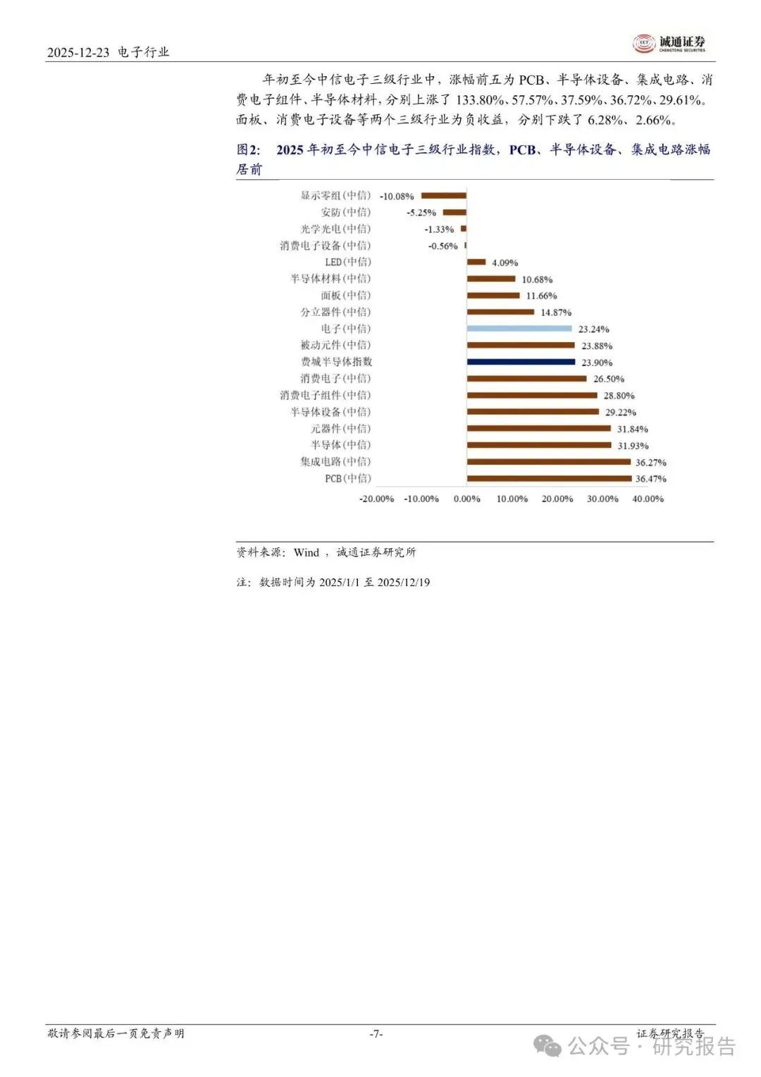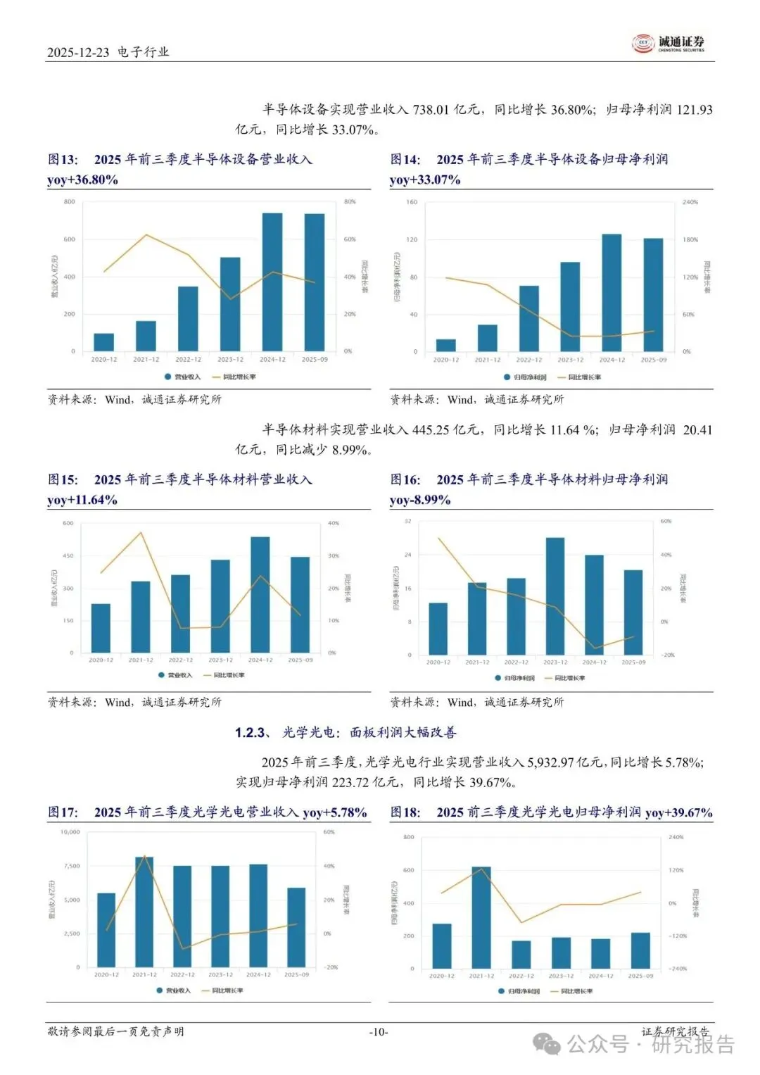 2025 年初至今,电子行业涨幅居前的细分板块为 PCB、半导体设备、集成电路,市场表现与业绩高度匹配。PCB:指数上涨 133.80%。AI 服务器与高速交换设备对高端产品需求高增,产业升级带来盈利弹性,2025 年前三季度归母净利润同比高增 77.76%。半导体设备:指数上涨 57.57%。
