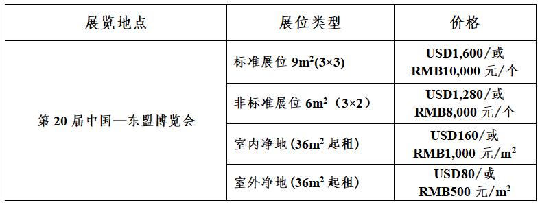 (注:1.标准展位及非标准展位配置:公司中英文楣板、围板、咨询桌1张、椅子2张、射灯2盏、500W单相插座1个、纸篓1个,铺设地毯;2.净地不含任何配置;3.展位搭建如需使用地图,请使用中国国家测绘局审定的标准地图,并提前1个月向中国—东盟博览会秘书处报审)
