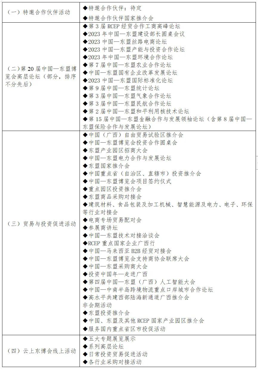 (注:部分论坛活动在第20届中国—东盟博览会会期以外举办。以上信息将动态更新,如有调整以中国—东盟博览会官网www.caexpo.org最新公布为准。)