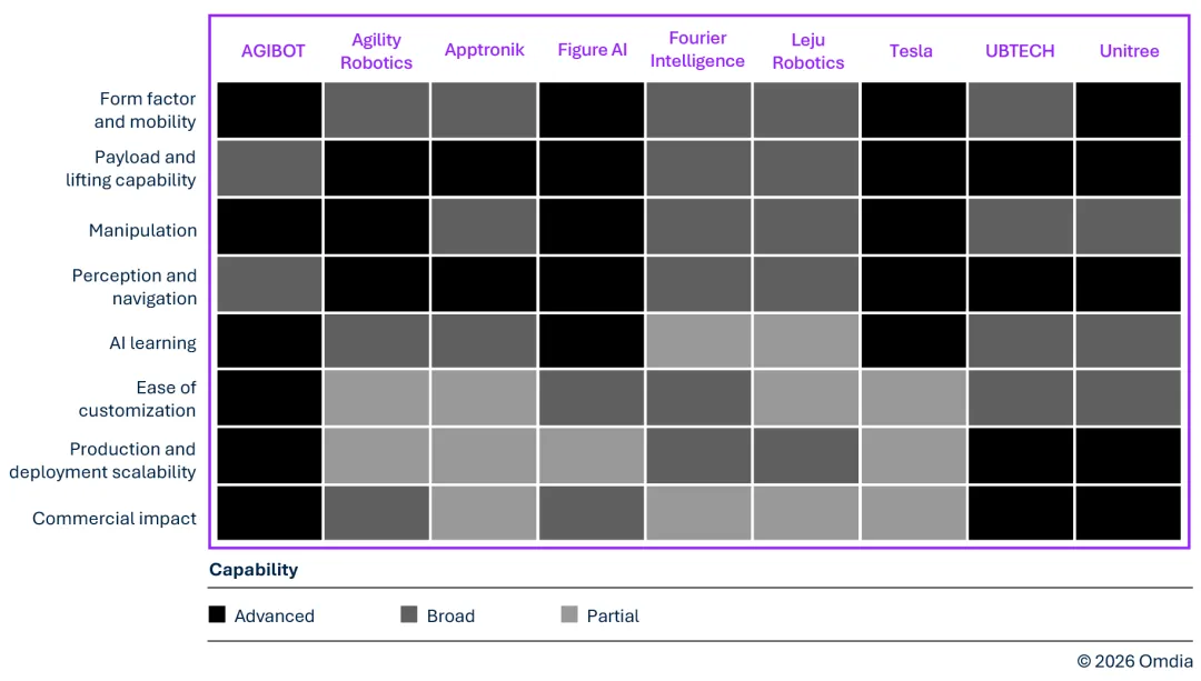 Omdia 对通用型具身智能机器人厂商的热力图说明如下: