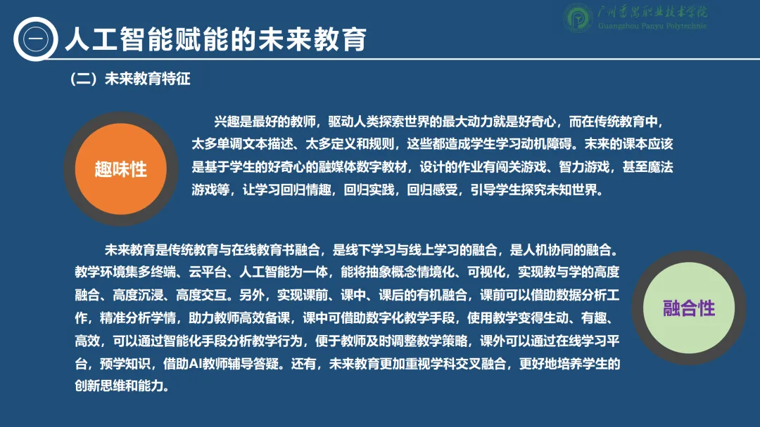 在人工智能赋能下,未来职业教育呈现鲜明特征。个性化方面,学生可自主选择学习路径,教育延伸至课堂之外,注重挖掘个体天赋与培养终身学习能力;多元性体现在学习形式、教学情境、评价方式等多维度的丰富拓展;开放性实现了学习资源共享与学习自主权的提升;趣味性通过融媒体教材、游戏化作业等形式激发学生好奇心与学习动力;融合性则体现为线上线下、人机协同、课前课中课后的全方位融合,以及学科交叉的深化。