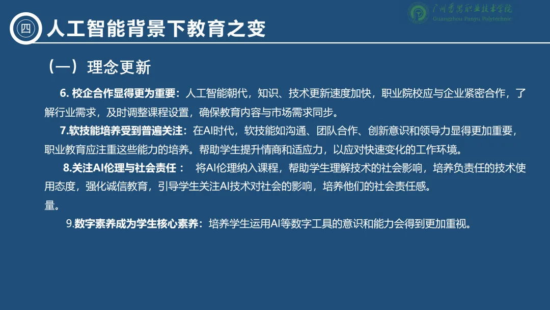 同时,职业教育在变革中仍有诸多核心坚守。各国对人工智能在教育中的使用多有规范,防范 “代劳式” 使用等问题。教育的根本宗旨始终是立德树人,培养全面发展的人,塑造学生正确价值观与关键能力;以人为本的教育理念不能动摇,坚持学生本位;教师的主导地位不可替代,其情感关怀与价值观引导是技术无法企及的;学生的批判性思维、独立解决问题等核心能力培养至关重要,需避免过度依赖技术;产教融合的人才培养模式需进一步深化,确保教育与行业需求同步;传统文化与红色基因作为精神根基,应得到传承与坚守。