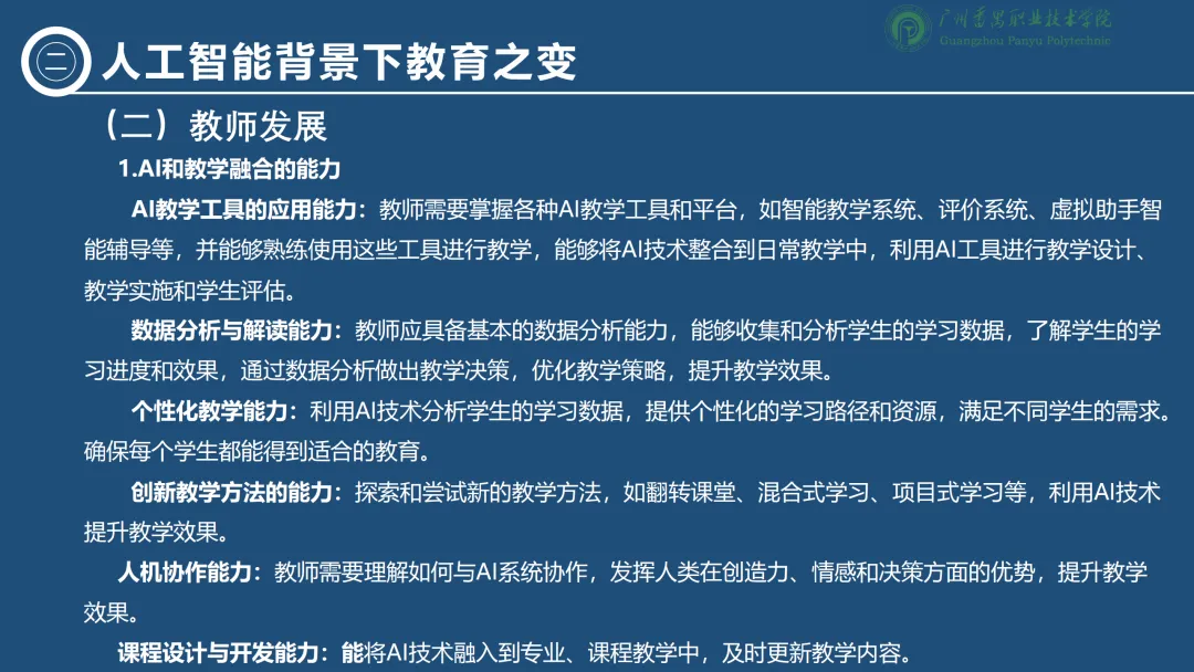 人工智能背景下,职业教育的变革体现在多个维度。理念更新上,强调跨学科能力、终身学习意识、实践创新能力、人机协作能力的培养,推进个性化教育,强化校企合作、软技能培养、AI 伦理与社会责任教育,将数字素养列为核心素养。教师发展方面,教师角色从知识传授者转变为多重身份,需提升数字素养、AI 与教学及专业的融合能力,队伍结构向教学创新团队、“双师型” 与机器人教师结合的模式转型。专业与课程层面,人才培养目标转向创新型、复合型人才,专业进行智能化升级,课程体系重构并融入 AI 相关内容。教学创新涵盖翻转课堂、混合式学习等模式,情景探究、虚拟仿真教学等多种方法,以及个性化、全面化的评价创新,还有丰富多样的教学资源创新与治理变革。