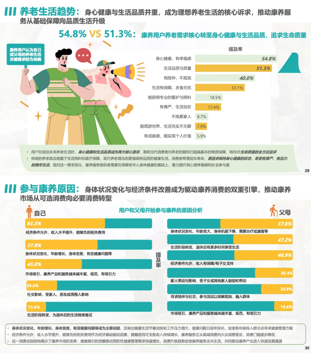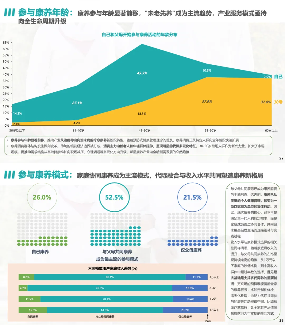 需求端健康养生为跨代共性,年轻重休闲情绪,年长聚焦养老康复;