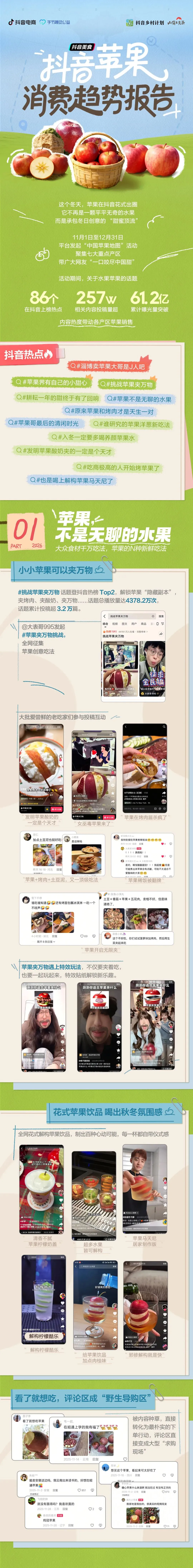 在抖音,苹果跳出食材本身,化身众多热门话题主角。@大表哥995 全网征集创意苹果吃法,小小苹果可以夹万物;@苹果哥孟飞 因码放苹果如“站军姿”受到广泛关注。活动期间,苹果相关话题曝光量超61.2亿。