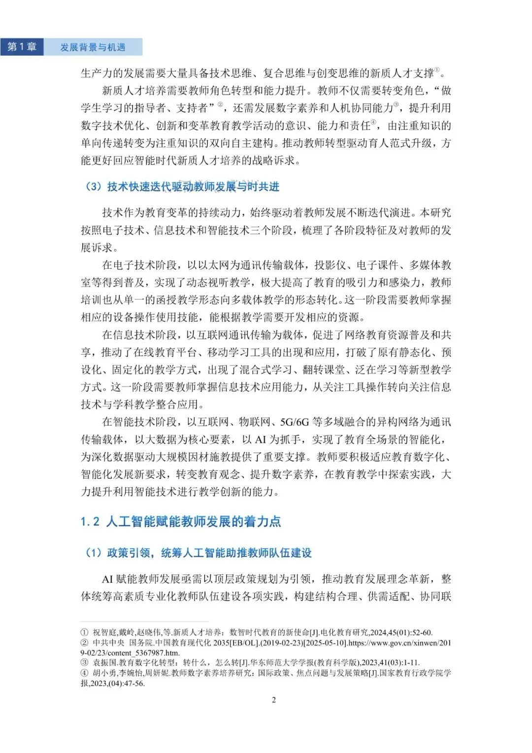 全球共识“教师质量=学习成果核心”,UNESCO2023战略、OECD2025报告均将教师适应性、创造力列为关键指标;我国2024—2035教育强国纲要提出“AI助推教师队伍建设”,2025年教育部发文系统部署“数字化赋能教师发展行动”。科技革命倒逼“新质人才”需求,教师角色从“知识传递者”转为“学习设计者+数据决策者”。三阶段技术演进显示:电子阶段普及投影,教师需会用硬件;信息阶段催生翻转课堂,教师需整合网络资源;智能阶段以大数据+AI为核心,教师必须具备人机协同教学能力。