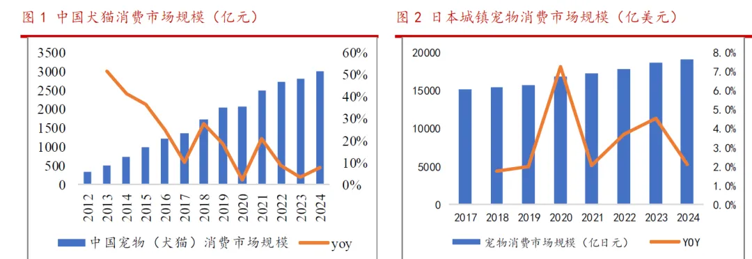2024年中国城镇宠物消费市场规模达到3002亿元,同比增长7.5%,其中犬/猫类消费同比增长4.6%/10.7%。近10年来看,2015-2024年中国城镇宠物消费市场CAGR为11.9%,高于美国、日本的9.7%/2.9%(日本为17-24年)。