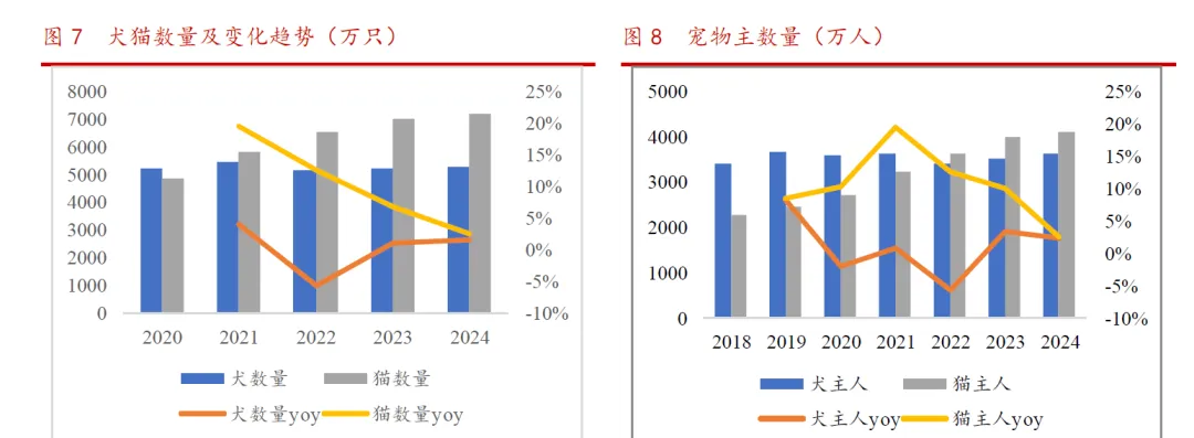 分量价来看,预计未来增长主要来自ASP提升。(1)量增仅低单位数:根据<<2025宠物行业白皮书>>,2024年城镇犬猫数量为12411万只,较2023年增长2.1%,较20年CAGR4.2%。其中,犬/猫分别为5258/7153万只,较2023年增长1.6%/2.5%,较2020年增长0.7%/47%。2024年城镇犬猫宠主人数量为7689万人,较2023年增长2.4%,较20年CAGR4.1%。其中,犬/猫主人3601/4088万人,增长2.3%/2.5%。(2)ASP中单位数增长。2024年单只犬/猫平均消费金额2961/2020元,增长3%/4.9%,较20年CAGR5.5%/2.1%。此外,根据艾媒咨询数据,2024年中国宠物饲养者每月进行宠物食品消费的频次集中在1-2次或3-4次,有八成以上的消费者年均消费超过500元,多数集中在501-1500元(64.89%),养宠人群为宠物购买食物较多,而在美国食物支出则低于45%,因此我们认为伴随行业消费者教育提升,食物外支出仍有较大提升空间。