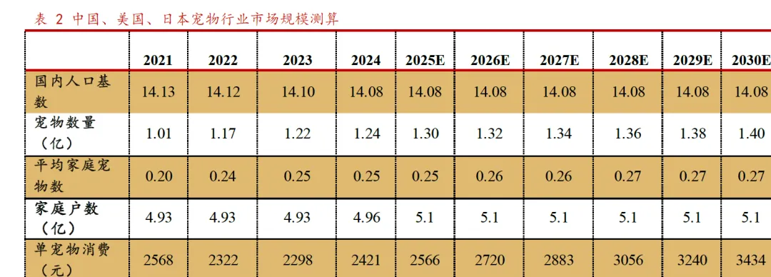 1)平均家庭宠物数:2024年我国平均家庭宠物数为0.25,我们假设2030年平均家庭宠物数达到0.274。