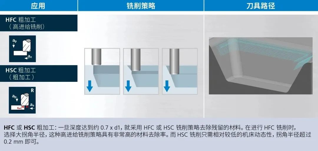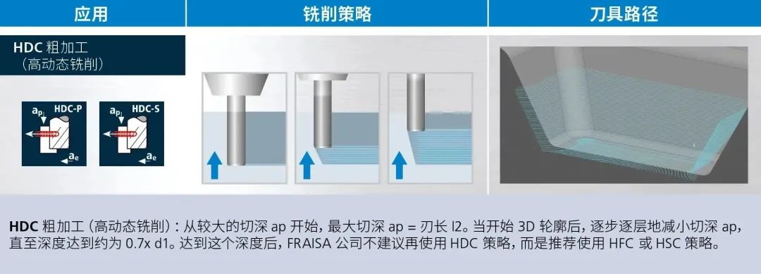 可由 CAM 程序员根据工件对所需应用进行最佳组合。首先借助 HDC 铣削策略对工件进行粗略切削。然后用 HFC 或 HSC 铣削策略对剩余材料进行粗加工。接着借助 HSC 策略进行半精加工。在 FRAISA ToolExpert® 中保存了以下应用所需的所有切削参数。