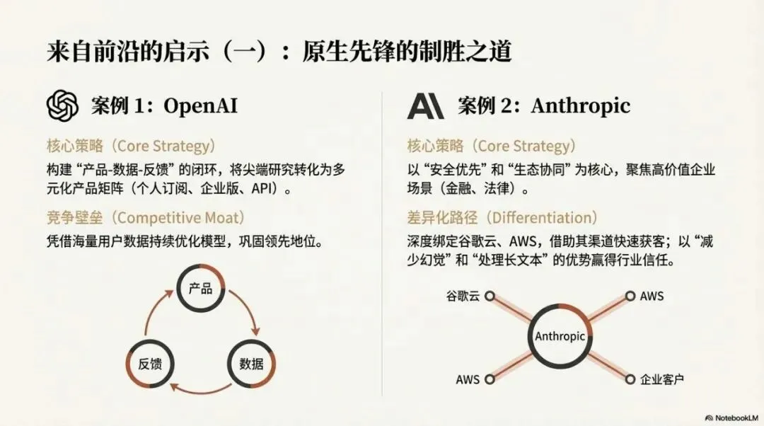 案例一:AI原生企业领导者OpenAI ,核心策略是构建 “产品 - 数据 - 反馈” 闭环,它成功地将尖端的研究能力转化为一个多元化的产品矩阵,覆盖了从消费者到大型企业的广泛市场。从 ChatGPT Plus 的个人订阅,到提供高级安全保障的企业版,再到开放 API 赋能开发者生态,形成了多元化收入结构。即便面临巨额算力成本,也凭借海量用户数据持续优化模型,巩固竞争壁垒。