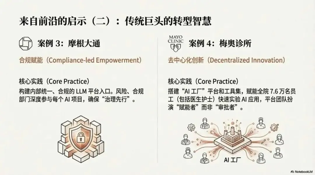 案例四:世界顶级医疗机构梅奥诊所的 “AI 工厂” 模式更具创新性。不同于建立集权式 AI 团队,梅奥搭建基于云平台的 AI 工具集,让全院7.6万名员工,包括医生、护士,都能快速实验 AI 应用。平台团队的角色是 “赋能者” 而非 “审批者”,提供技术支持与合规指导,这种去中心化模式,极大激发了一线的创新活力。
