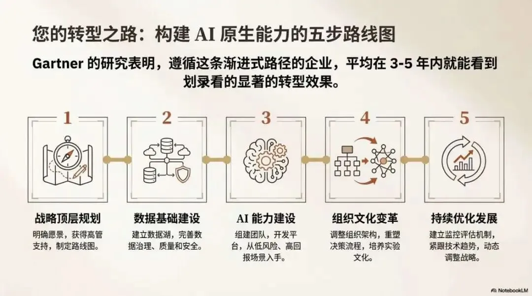 面对AI原生企业的崛起,传统企业并非无计可施。Gartner提出了一条渐进式的转型路径,帮助传统企业逐步构建AI原生能力。