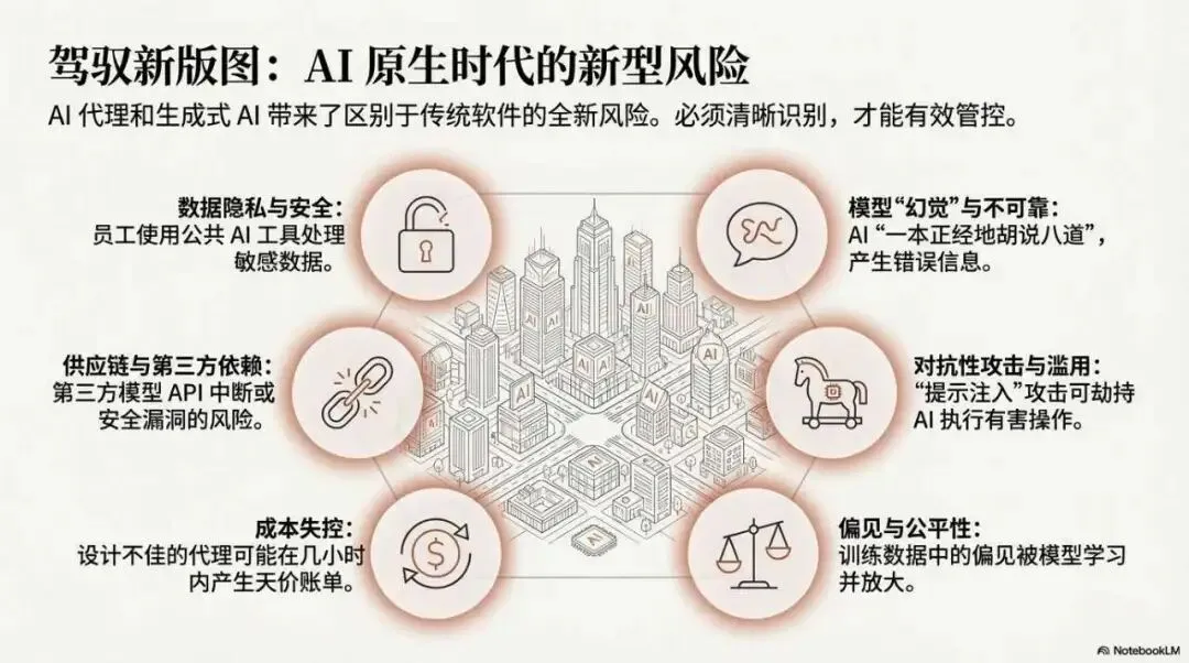 AI代理和生成式AI的引入,带来了区别于传统软件的全新风险。企业必须清晰地识别并理解这些风险,才能进行有效管控。
