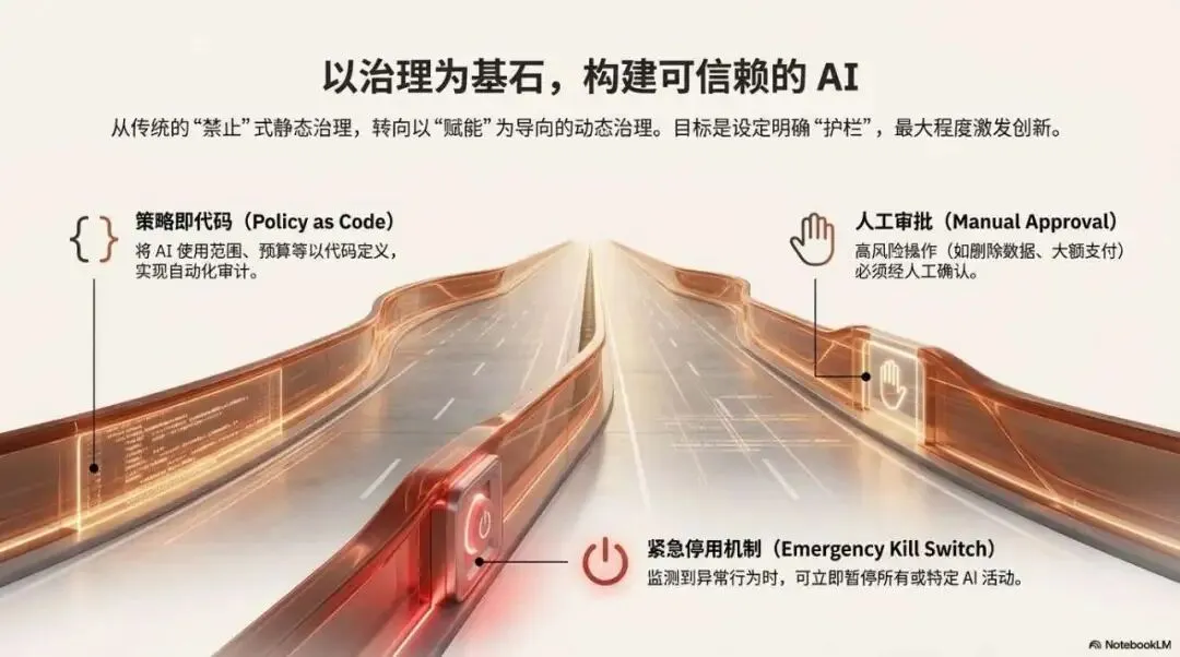 三大核心治理机制,是 AI 安全运行的 “防护网”。首先是 “策略即代码”,将 AI 可使用的工具、数据范围、预算限制等,都以代码形式定义,实现治理规则的版本控制与自动化审计;其次是 “人工审批”,高风险操作,例如删除核心数据、对外大额支付等,必须经人工确认后才能执行,避免灾难性错误。最后是 “紧急停用机制”,建立全局高权限的 “紧急停用”,一旦监测到 AI 异常行为或安全威胁,可立即暂停所有或特定 AI 活动,避免损失扩大。这三大机制结合,能在保障创新效率的同时,将风险控制在可接受范围。