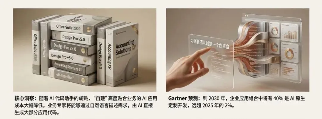 趋势一:AI将重塑软件的“构建与购买”决策。定制化应用爆发,随着 AI 代码助手成熟,企业 “自建贴合业务的 AI 应用” 成本大幅降低,2030 年,企业应用组合中将有40%是 AI 原生定制开发,远超 2025 年的 2%。未来,随着“需求规格驱动开发”的成熟,业务专家将能够通过自然语言描述需求,由AI直接生成大部分应用代码。这将使得“构建”一个高度贴合自身业务的定制化应用的吸引力,在很多场景下将超过“购买”一个标准化产品。