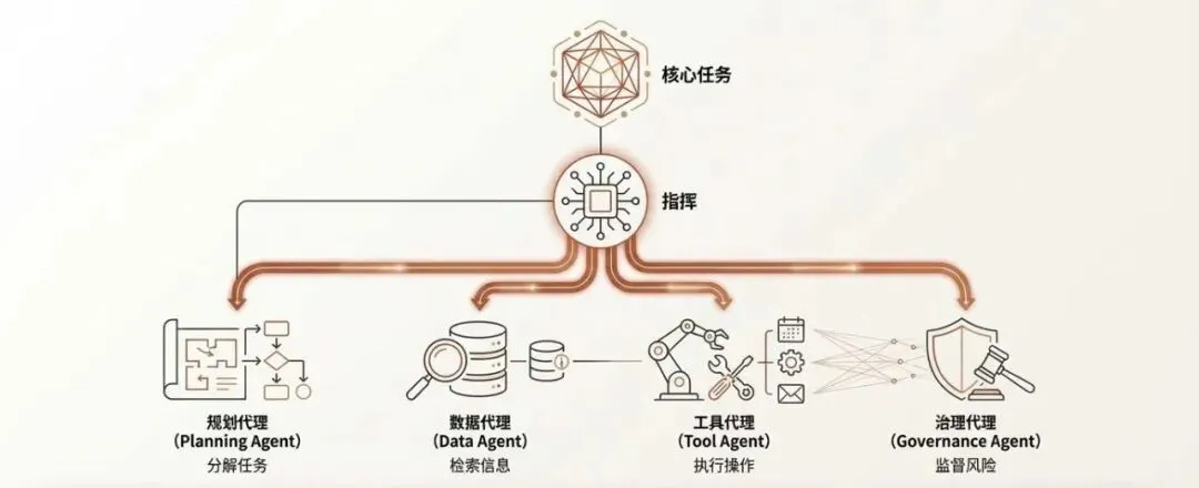 趋势二:从“单一超级模型”到“多智能体系统”的转变。 多智能体系统崛起,竞争焦点从单一大模型的 “智商”,转向多 AI 代理的协同效率 ,比如由 “规划代理” 分解任务、“数据代理” 检索信息、“工具代理”负责执行操作、“治理代理” 监督风险,形成类似人类组织的协作模式。构建和编排这种多智能体系统的能力,将成为企业新的核心竞争力。