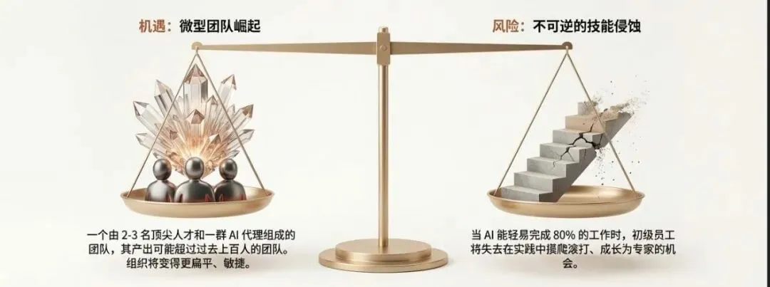 趋势三:“微型团队”与“技能侵蚀”并存的人才悖论。 AI的赋能将催生更多“微型团队”。一个由2-3名顶尖人才和一群AI代理组成的团队,其产出可能超过过去几十甚至上百人的团队。这将使组织结构变得更加扁平、敏捷。但过度依赖 AI 可能导致员工技能侵蚀,Gartner发出严峻警告,到2030 年,半数组织将因为过度依赖AI而面临不可逆的技能侵蚀。当AI能轻易完成80%的工作时,初级员工将失去在实践中摸爬滚打、成长为专家的机会。